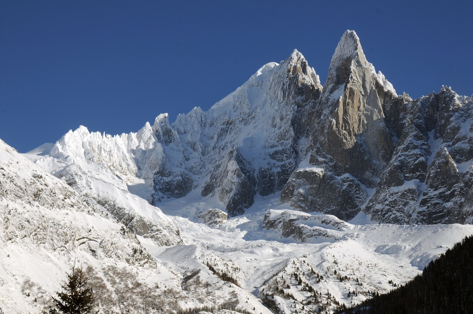 The Aiguille du Dru (also the Dru or the Drus; French, Les Drus) is a mountain in the Mont Blanc massif in the French Alps. It is situated to the east of the village of Les Praz in the Chamonix valley. “Aiguille” means “needle” in French.