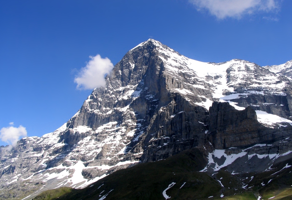 The first mention of Eiger, appearing as “mons Egere”, was found in a property sale document of 1252, but there is no clear indication of how exactly the peak gained its name.[6] The three mountains of the ridge are commonly referred to as the Virgin (German: Jungfrau – translates to “virgin” or “maiden”), the Monk (Mönch), and the Ogre (Eiger; the standard German word for ogre is Oger). The name has been linked to the Latin term acer, meaning “sharp” or “pointed”.