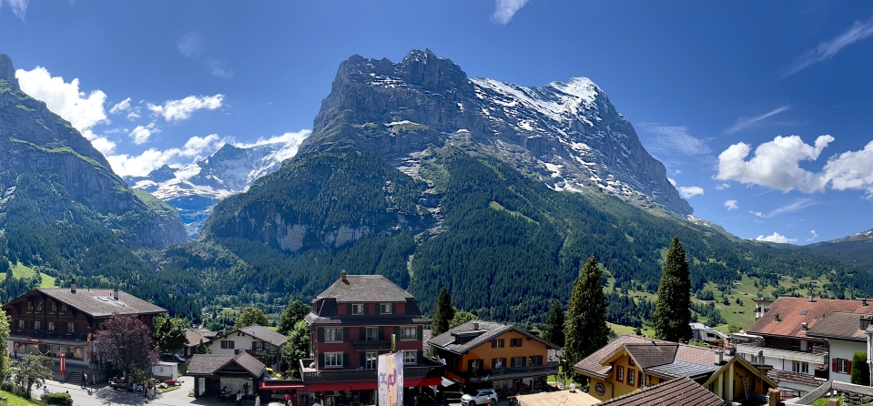 The Eiger (German pronunciation: [ˈaɪ̯ɡɐ] ⓘ) is a 3,967-metre (13,015 ft) mountain of the Bernese Alps, overlooking Grindelwald and Lauterbrunnen in the Bernese Oberland of Switzerland, just north of the main watershed and border with Valais. It is the easternmost peak of a ridge crest that extends across the Mönch to the Jungfrau at 4,158 m (13,642 ft), constituting one of the most emblematic sights of the Swiss Alps. While the northern side of the mountain rises more than 3,000 m (10,000 ft) above the two valleys of Grindelwald and Lauterbrunnen, the southern side faces the large glaciers of the Jungfrau-Aletsch area, the most glaciated region in the Alps. The most notable feature of the Eiger is its nearly 1,800-metre-high (5,900 ft) north face of rock and ice, named Eiger-Nordwand, Eigerwand or just Nordwand, which is the biggest north face in the Alps.[3] This substantial face towers over the resort of Kleine Scheidegg at its base, on the eponymous pass connecting the two valleys.