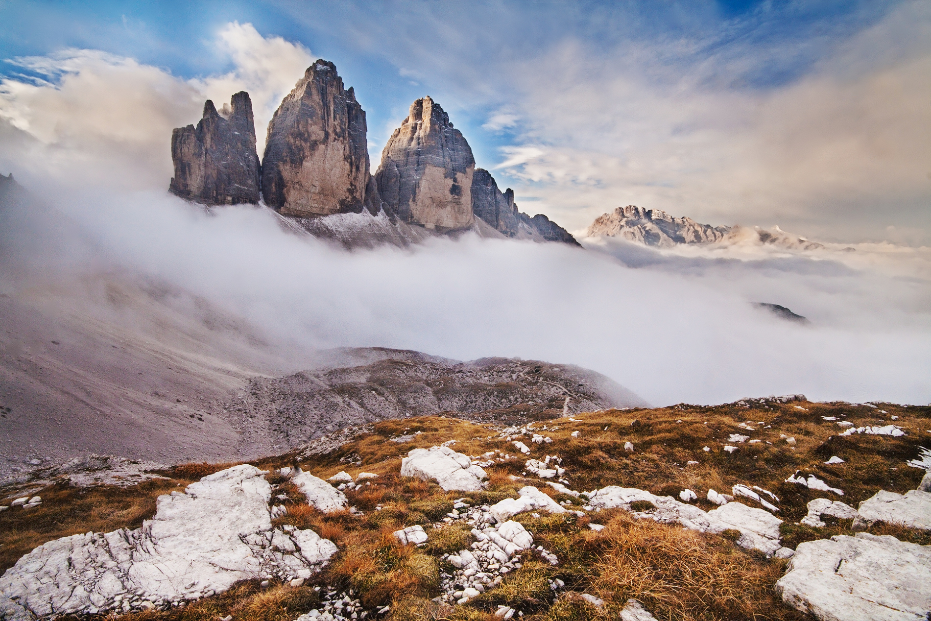 The Three Peaks of Lavaredo (Drei Zinnen in German ; Tré Zìmes in Ladin Cadore[[1]) are three peaks of the Dolomites site in the municipality of Auronzo di Cadore and bordering on that of the Dolomites of Sesto in the municipality of Dobbiaco; they are considered among the most famous mountains in the world of mountaineering, with the Cima Grande which represents one of the classic northern walls of the Alps, and allow the panoramic view of the mountains.