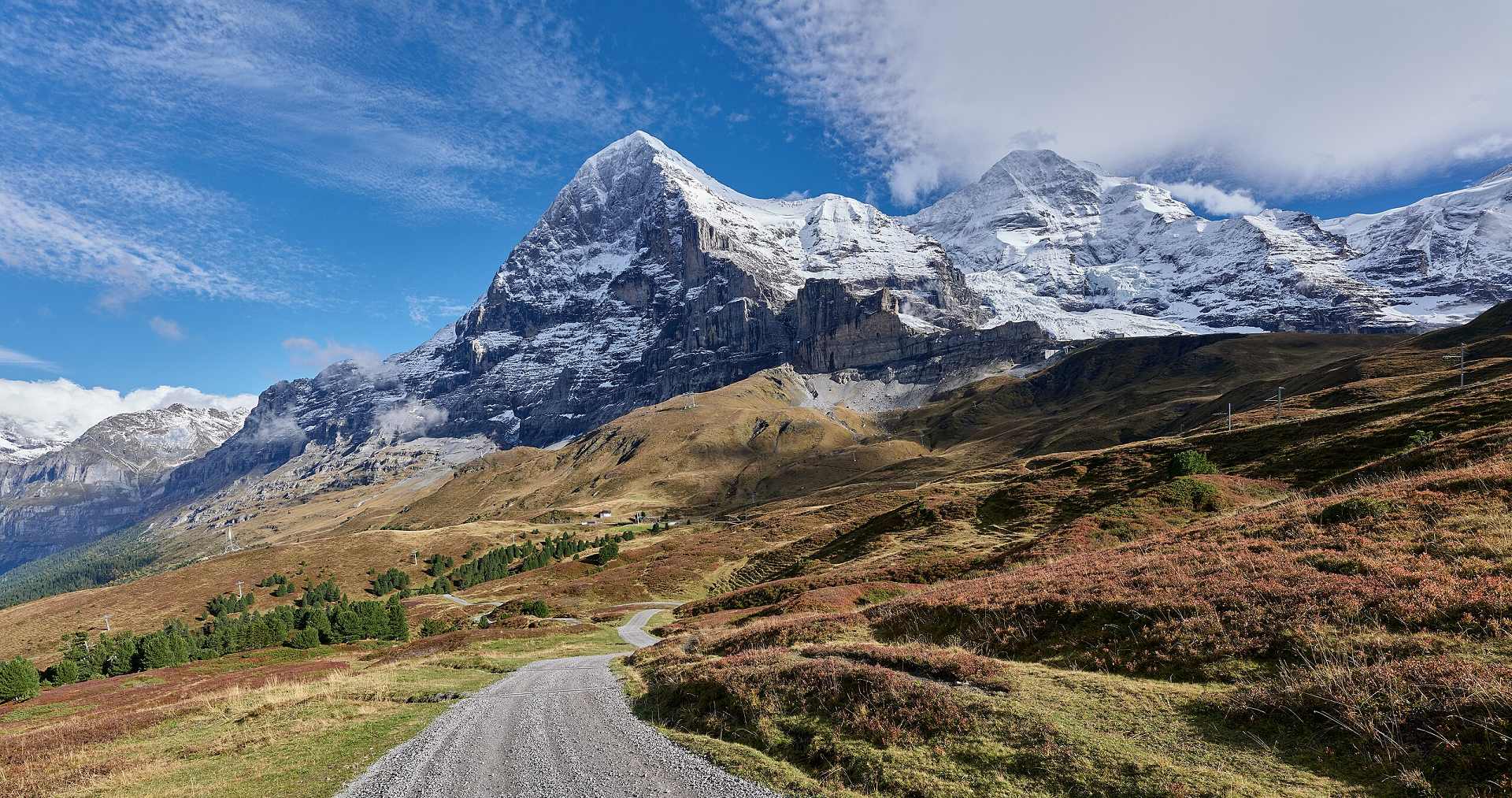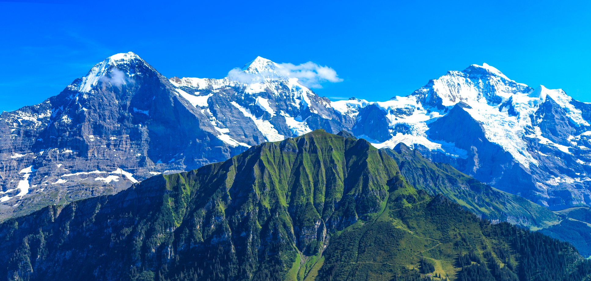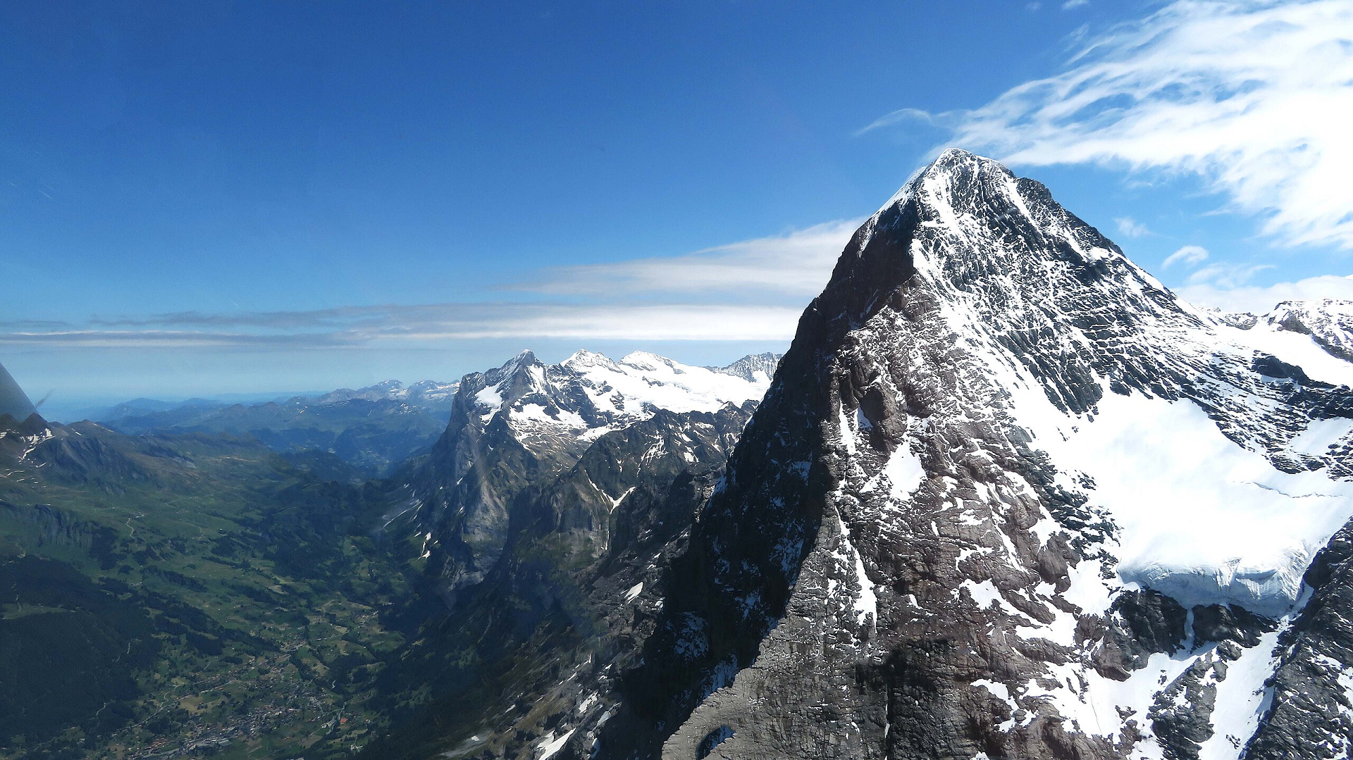 The Eiger (German pronunciation: [ˈaɪ̯ɡɐ] ⓘ) is a 3,967-metre (13,015 ft) mountain of the Bernese Alps, overlooking Grindelwald and Lauterbrunnen in the Bernese Oberland of Switzerland, just north of the main watershed and border with Valais. It is the easternmost peak of a ridge crest that extends across the Mönch to the Jungfrau at 4,158 m (13,642 ft), constituting one of the most emblematic sights of the Swiss Alps. While the northern side of the mountain rises more than 3,000 m (10,000 ft) above the two valleys of Grindelwald and Lauterbrunnen, the southern side faces the large glaciers of the Jungfrau-Aletsch area, the most glaciated region in the Alps. The most notable feature of the Eiger is its nearly 1,800-metre-high (5,900 ft) north face of rock and ice, named Eiger-Nordwand, Eigerwand or just Nordwand, which is the biggest north face in the Alps.[3] This substantial face towers over the resort of Kleine Scheidegg at its base, on the eponymous pass connecting the two valleys.