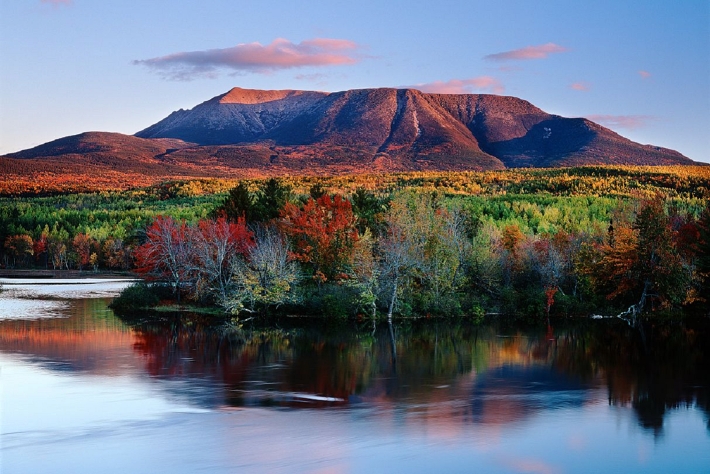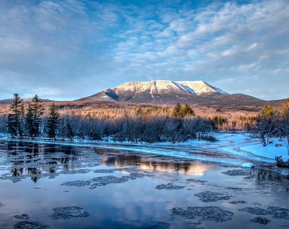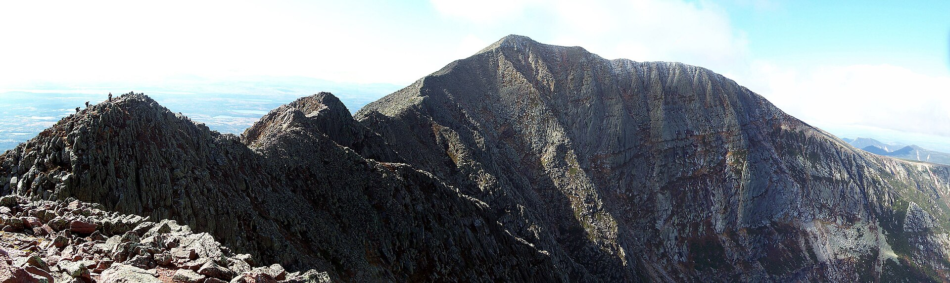 Mount Katahdin (/kəˈtɑːdɪn/ kə-TAH-din) is the highest mountain in the U.S. state of Maine at 5,269 feet (1,606 m). Named Katahdin, which means “Great Mountain”,[3] by the Penobscot Native Americans, it is within Northeast Piscataquis, Piscataquis County, and is the centerpiece of Baxter State Park. It is a steep, tall massif formed from a granite intrusion weathered to the surface. The flora and fauna on the mountain are typical of those found in northern New England, with the summit hosting fragile and endangered alpine tundra.