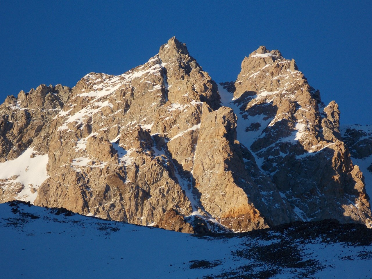 Starting from Misses Kosh the ridge is accessed by crossing the West Ridge of Misses-Tau then continuing to the Russian Bivouac located by a hanging glacier descending from the North Ridge of Dykhtau, 4 hours from Misses-Kosh. Once a notch between Misses-Tau and Dykhtau is gained, the North Ridge is followed to the summit. Allow 2 and a half days from the Russian Bivouac, there are several good bivouac sites on the North Ridge (Details and map Archived 2016-03-04 at the Wayback Machine).