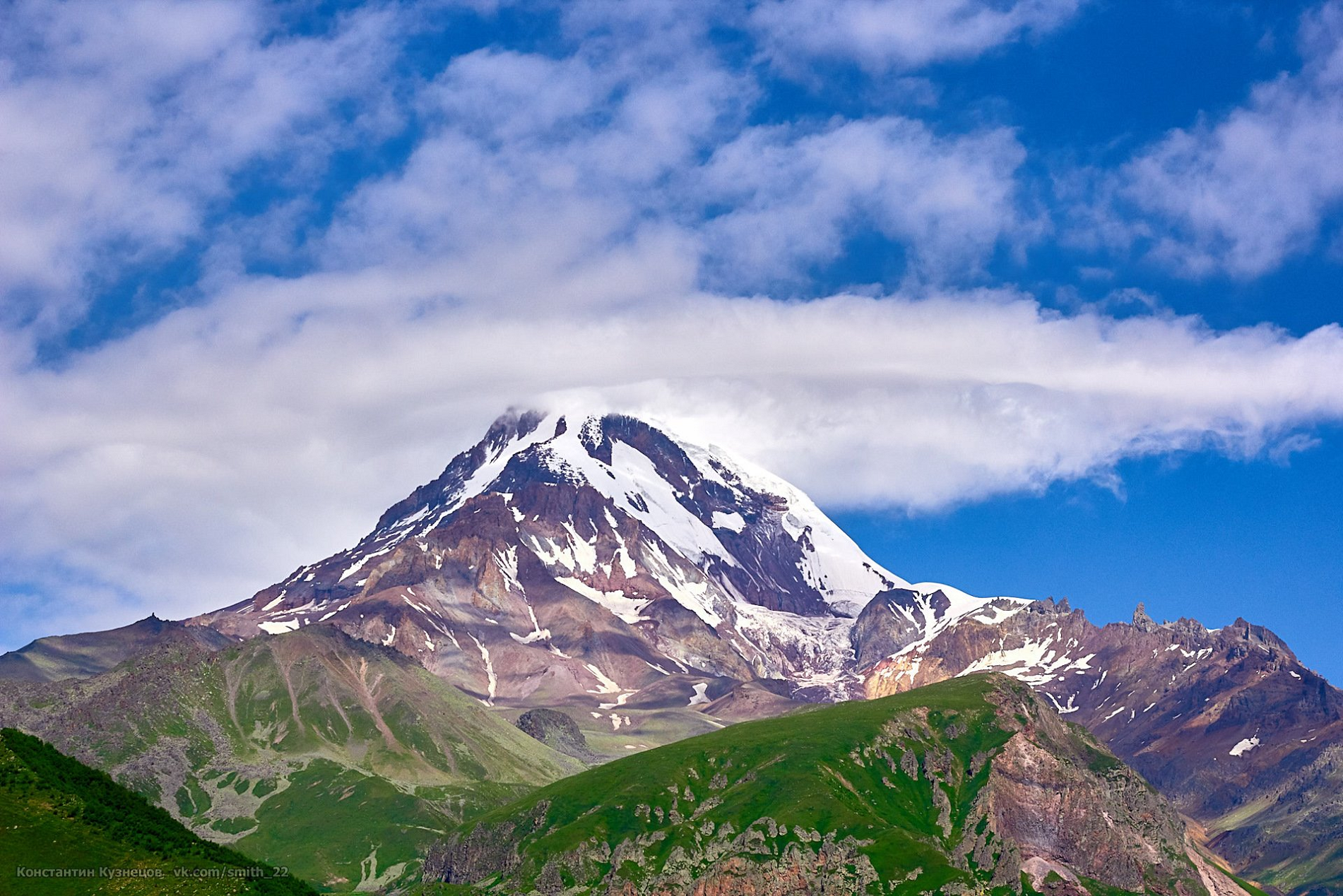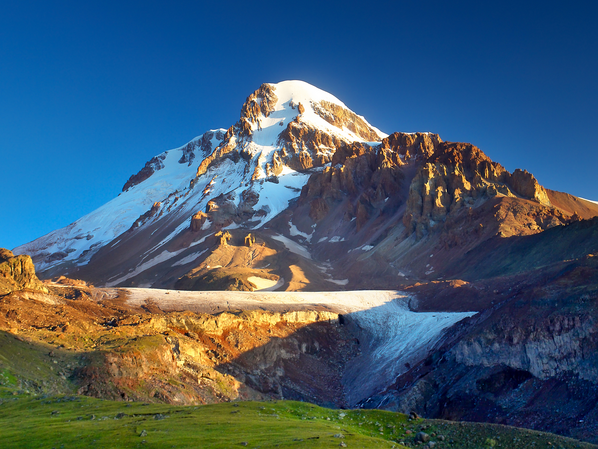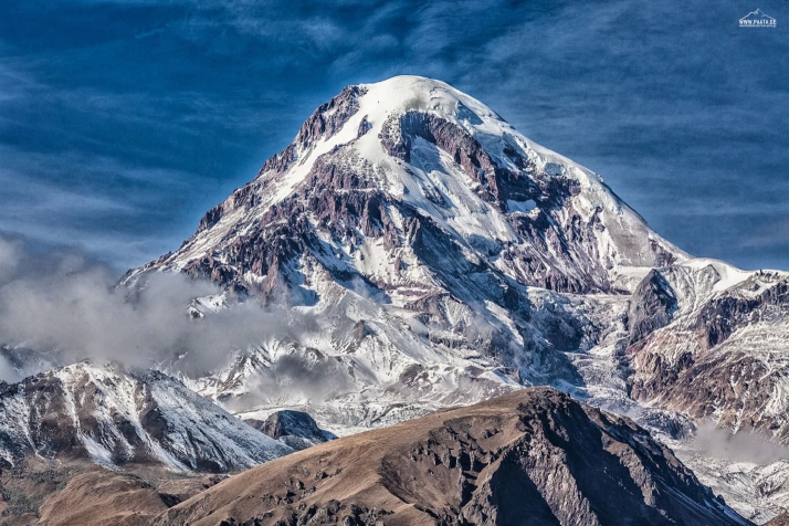 Mount Kazbek or Mount Kazbegi[a] is a dormant stratovolcano and one of the major mountains of the Caucasus, located in Georgia, just south of the border with Russia.[6]