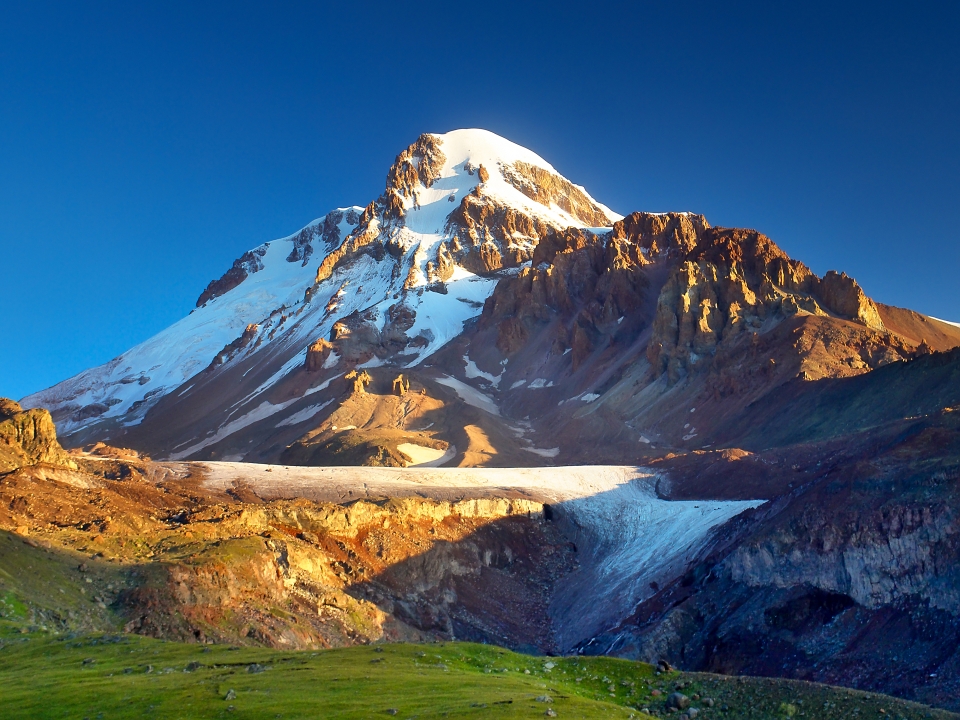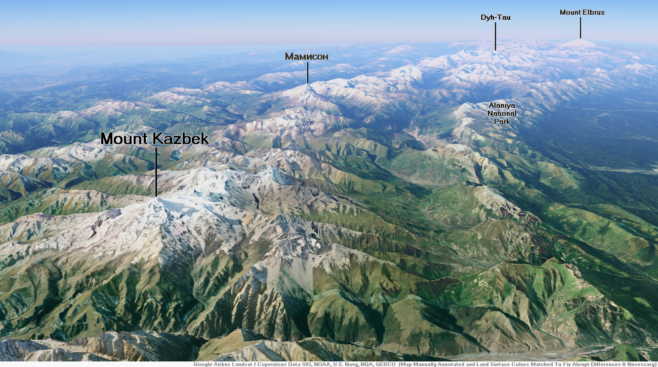 The name Kazbegi is disputed; some claims are it is named after a Circassian nobleman who lived on it, other claims are it is named after local nobleman Dimitri Chopikashvili (grand father of the Georgian writer Aleksandre Kazbegi) who was given the title of “Kazbeg” by Georgian king Erekle II. The word “Kazbek” means a “nobleman” in Kabardian language. The title appeared under Georgian king Rostom in the 17th century. The name of the mountain in Georgian, Mqinvartsveri, translates to “Glacier Peak” or “Freezing Cold Peak”.[7] The Ingush name Beshloam and Chechen name Bashlam translates as “Molten Mount”.