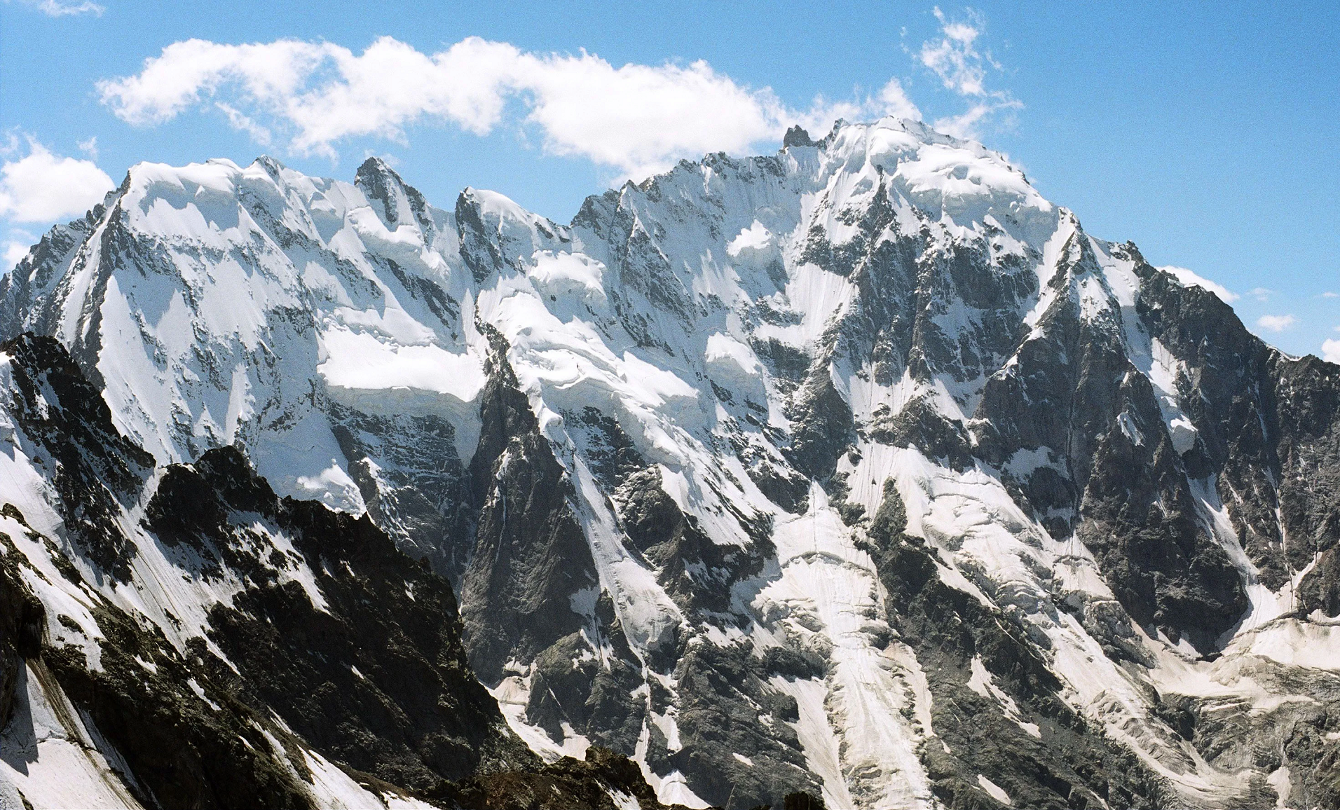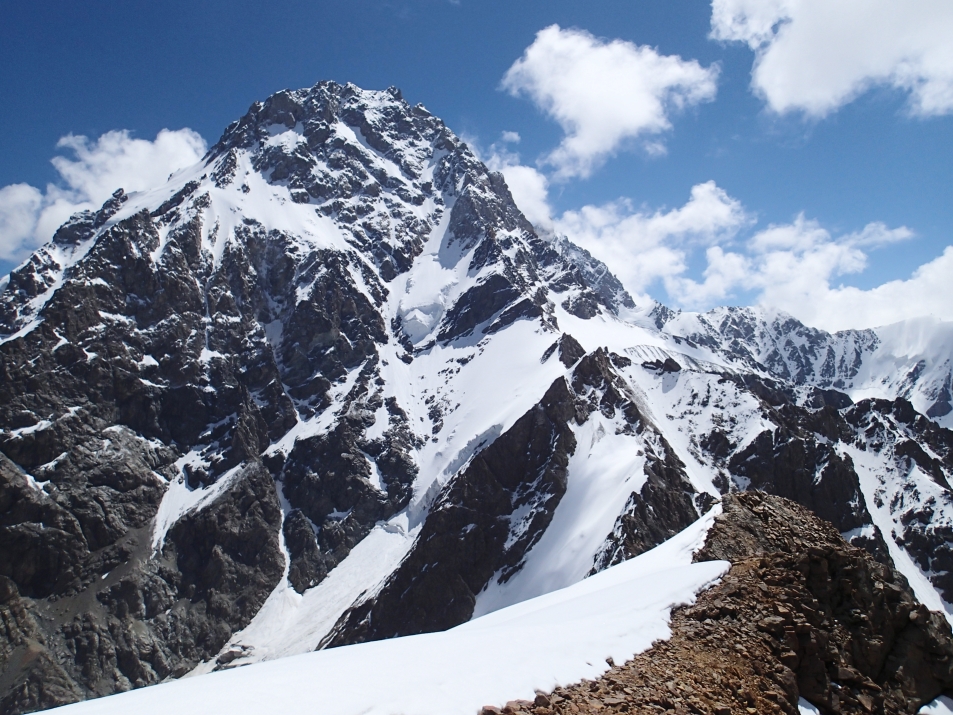 This is one of the Caucasian Peaks, facing the Bezingi Wall across the Bezingi Glacier. The first ascent in 1888 by Albert Mummery and Heinrich Zurfluh of Meiringen was a major achievement at the time.[3] Their route up the SW Ridge is no longer used as the normal route which is now the North Ridge graded 4B (Russian Grading).[citation needed]
