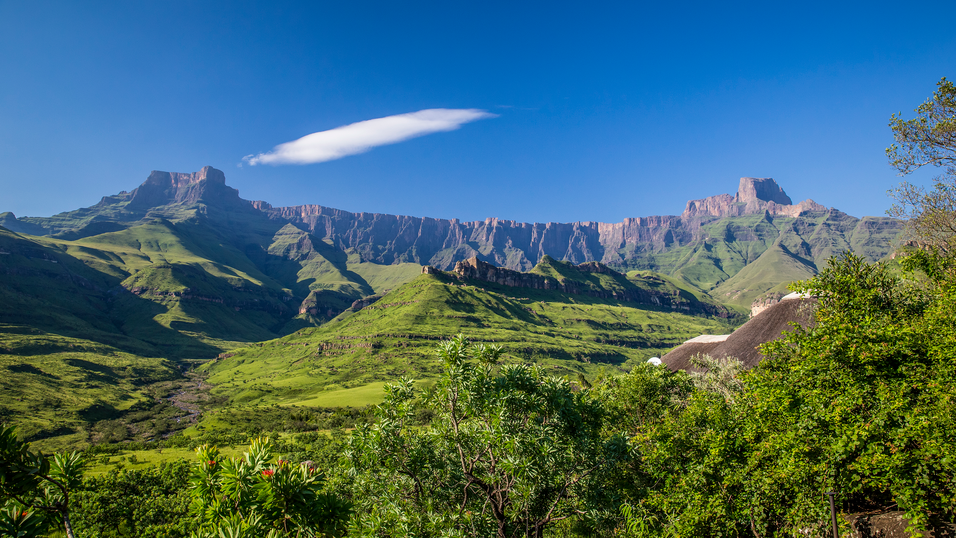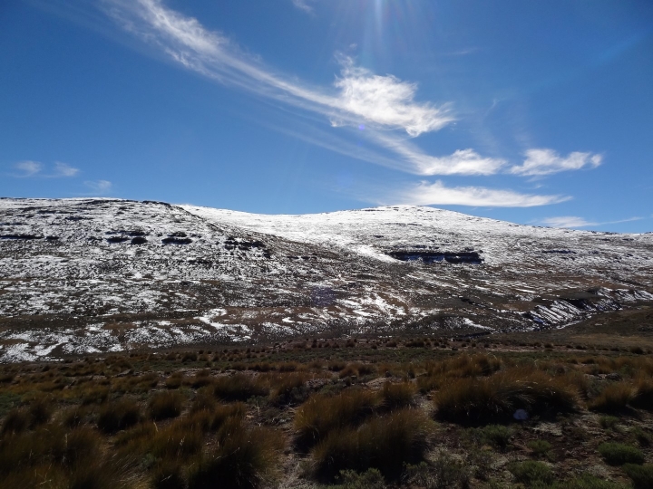 Thabana Ntlenyana is situated on the Mohlesi ridge, north of the treacherous Sani Pass.[4]: 81 The peak is climbed as part of a “Grand Traverse” of the Maloti, which follows a large system of peaks within the Maloti (Maluti) and the broader Drakensberg.[7] Thabana Ntlenyana, like the broader highlands around it, is made of amygdaloidal flood basalt that formed during the Upper Triassic and Lower Jurassic epochs.[8] Nearby the mountain are the headwaters of the Orange River, which runs approximately 1,300 kilometres (810 mi) to the west before draining into the Atlantic Ocean. Together with its main tributary, the Vaal River, the Orange River’s catchment spans around 855,000 square kilometres (330,000 sq mi) of land across Southern Africa.[9]