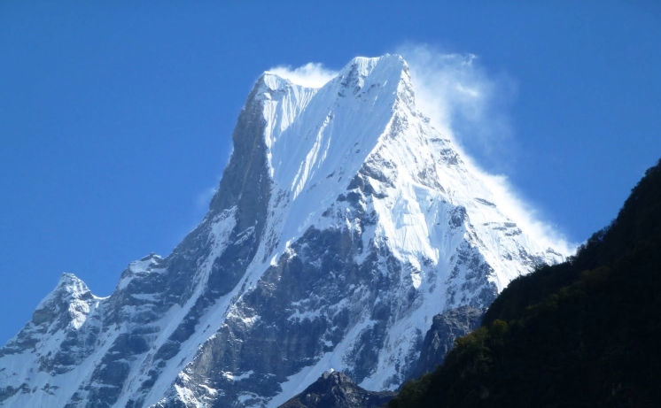 Machapuchare, Machhapuchchhre or Machhapuchhre (from Nepali माछापुच्छ्रे ‘fishtail’, Tamu: कतासुँ क्लिको), is a mountain situated in the Annapurna massif of Gandaki Province, north-central Nepal. Its highest peak has never been officially climbed due to the impossibility of gaining a permit from the government of Nepal.