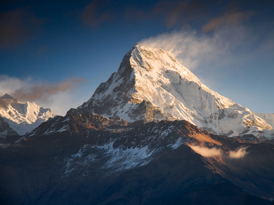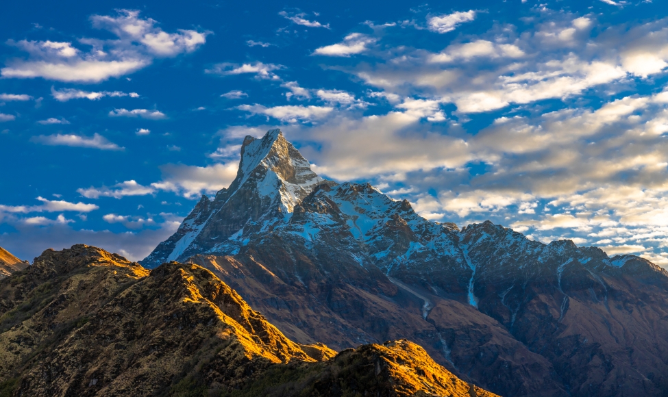 Due to its southern position in the range and the particularly low terrain that lies south of the Annapurna Himalayas, which contains three of the 10 highest peaks in the world, Machapuchare commands tremendous vertical relief in a short horizontal distance. This, combined with its steep, pointed profile, makes it a particularly striking peak, despite its lower elevation than some of its neighbors. Its double summit resembles the tail of a fish, hence the name meaning “fish’s tail” in Nepalese. It is also nicknamed the “Matterhorn of Nepal”.