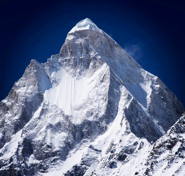 Ama Dablam is a mountain in the eastern Himalayan range of Koshi Province, Nepal. The main peak is 6,812 metres (22,349 ft), the lower western peak is 6,170 metres (20,243 ft). Ama Dablam means “mother’s necklace”; the long ridges on each side like the arms of a mother (ama) protecting her child, and the hanging glacier thought of as the dablam, the traditional double-pendant containing pictures of the gods, worn by Sherpa women.[3] For several days, Ama Dablam dominates the eastern sky for anyone trekking to Mount Everest Base Camp. For its soaring ridges and steep faces Ama Dablam is sometimes referred as the “Matterhorn of the Himalayas.”[4] The mountain is featured on the one rupee Nepalese banknote.[5]
