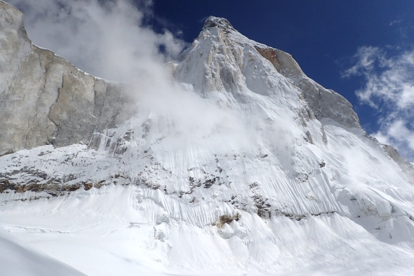 The first ascent was made in 1974 by a French expedition led by Yannick Seigneur and the clarinettist and composer Jean-Christian Michel.[2] The summit team included Louis Dubost, Paul Gendre and Jacques Brugirard.
