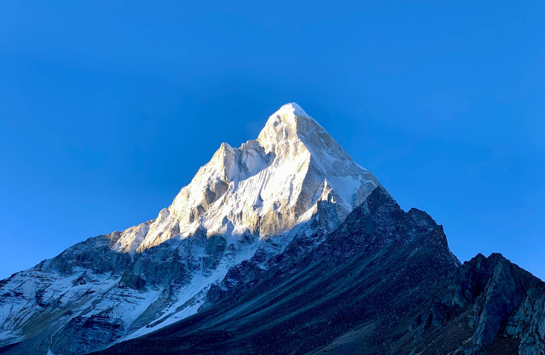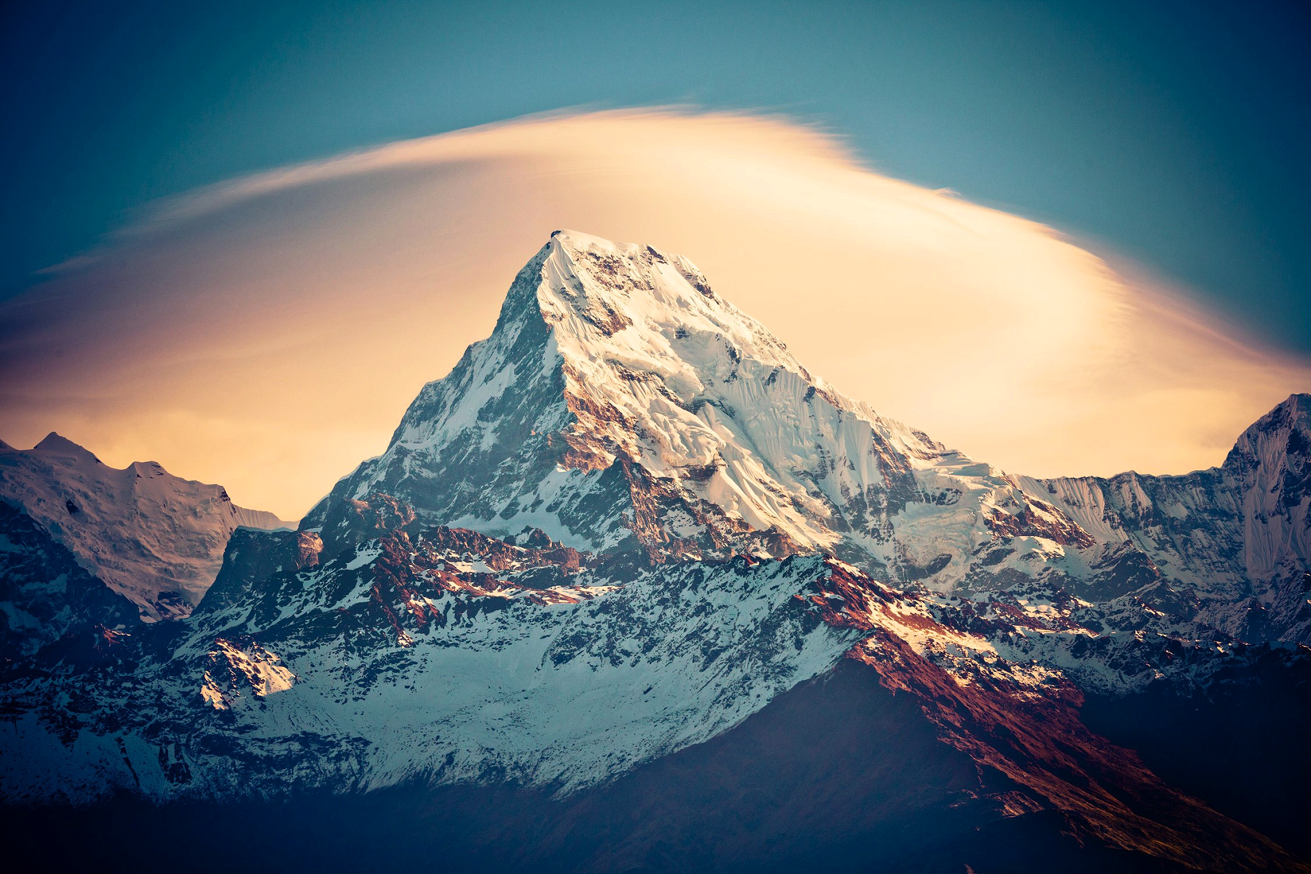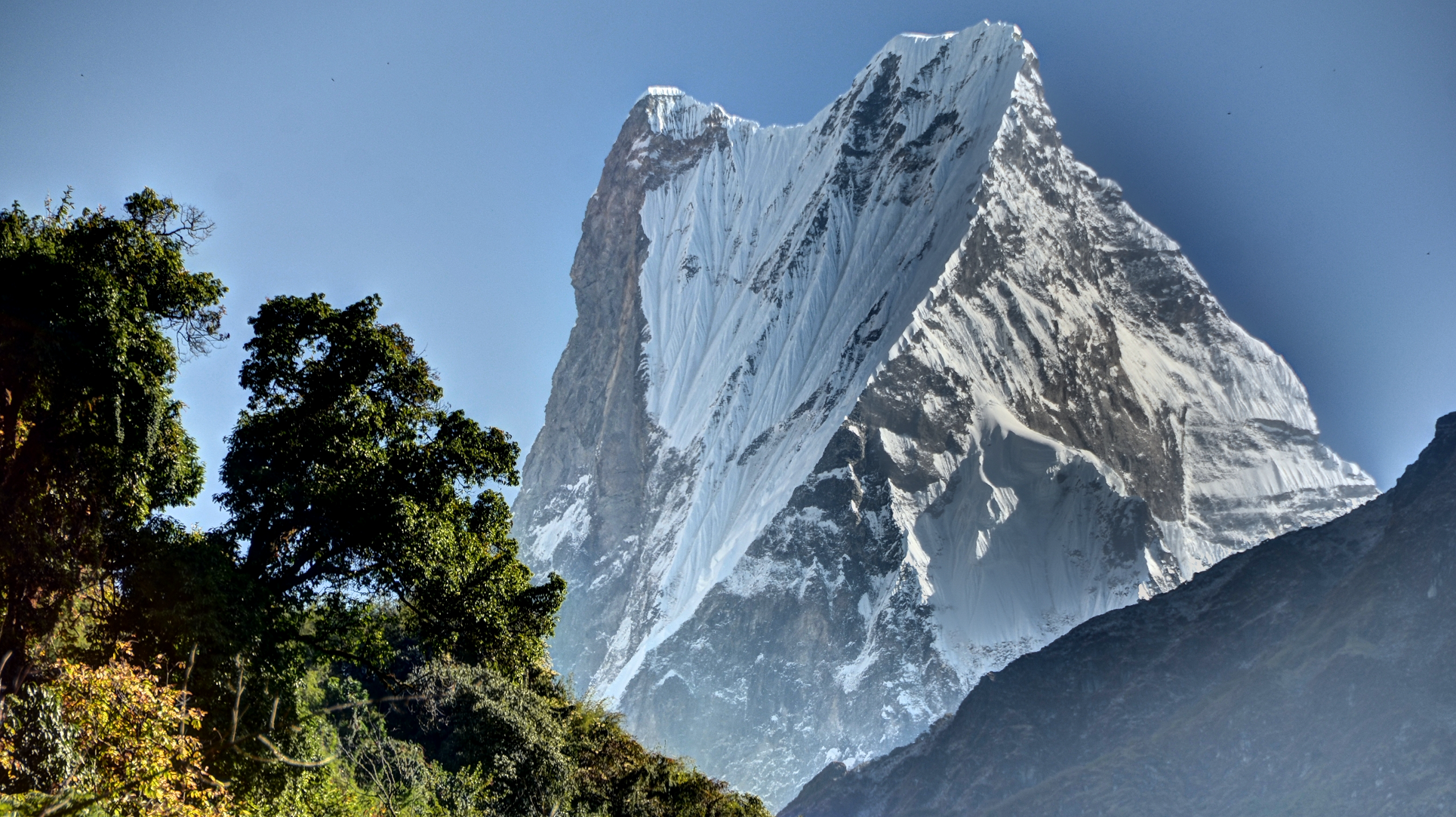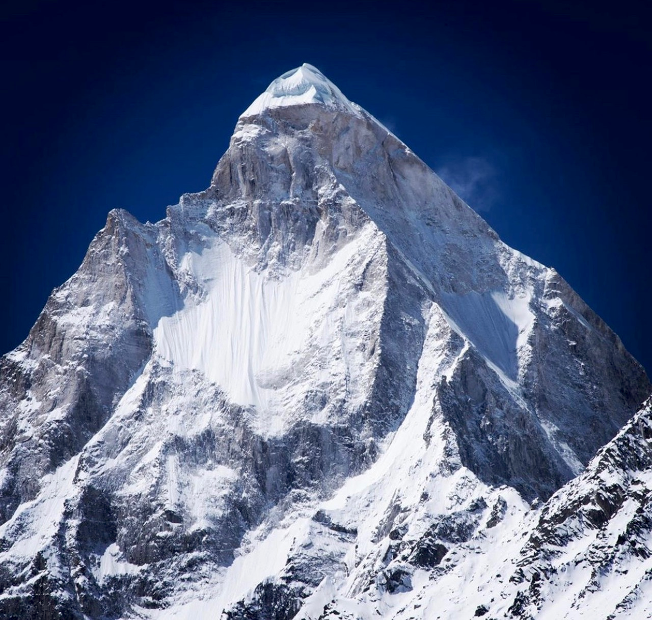 Due to its southern position in the range and the particularly low terrain that lies south of the Annapurna Himalayas, which contains three of the 10 highest peaks in the world, Machapuchare commands tremendous vertical relief in a short horizontal distance. This, combined with its steep, pointed profile, makes it a particularly striking peak, despite its lower elevation than some of its neighbors. Its double summit resembles the tail of a fish, hence the name meaning “fish’s tail” in Nepalese. It is also nicknamed the “Matterhorn of Nepal”.