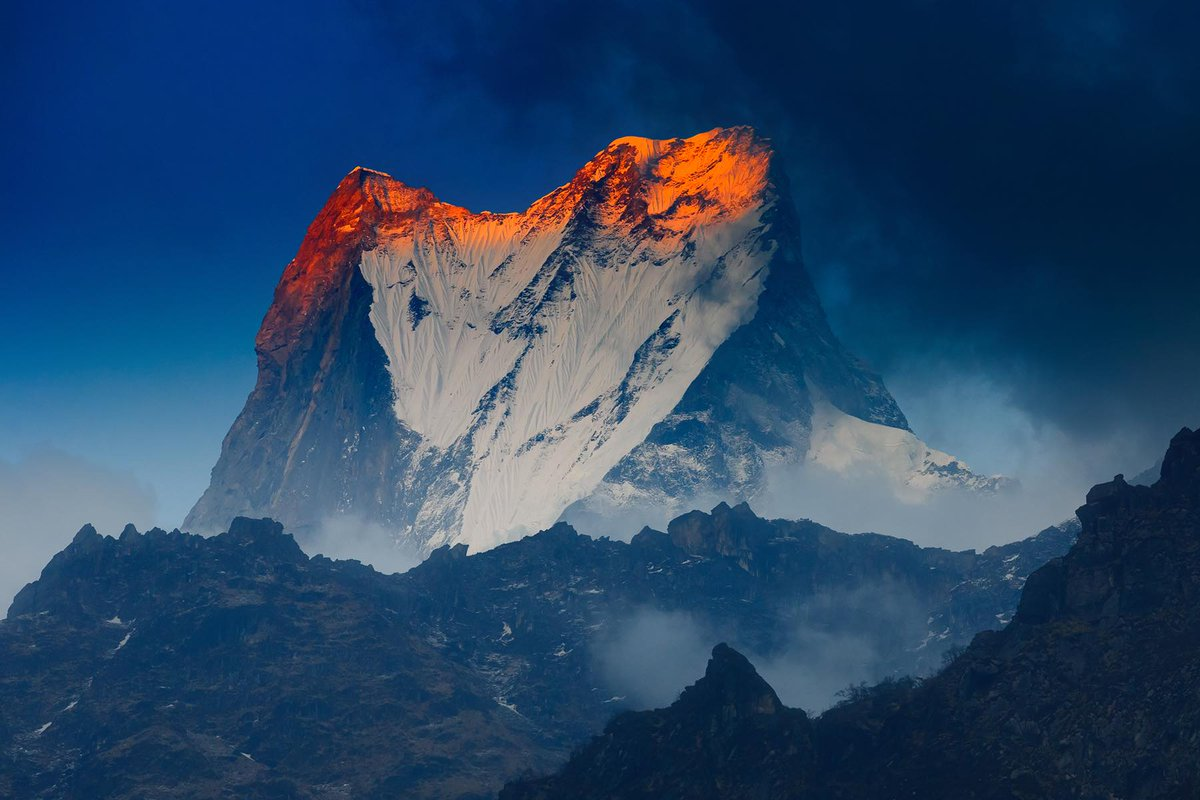 Machapuchare, Machhapuchchhre or Machhapuchhre (from Nepali माछापुच्छ्रे ‘fishtail’, Tamu: कतासुँ क्लिको), is a mountain situated in the Annapurna massif of Gandaki Province, north-central Nepal. Its highest peak has never been officially climbed due to the impossibility of gaining a permit from the government of Nepal.