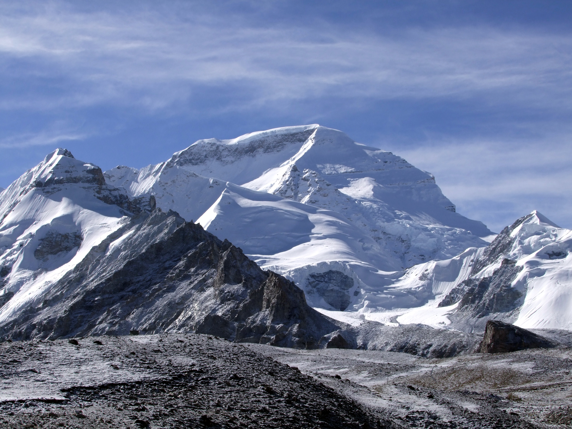 Pumori (Nepali: पुमोरी, Chinese: 普莫里峰) (or Pumo Ri) is a mountain on the Nepal–China border in the Mahalangur section of the Himalayas. Pumori lies just eight kilometres west of Mount Everest. Pumori, meaning “the Mountain Daughter” in Sherpa language, was named by George Mallory. “Pumo” means young girl or daughter and “Ri” means mountain in Sherpa language.[4] Climbers sometimes refer to Pumori as “Everest’s Daughter”.[5] Mallory also called it Clare Peak, after his daughter.