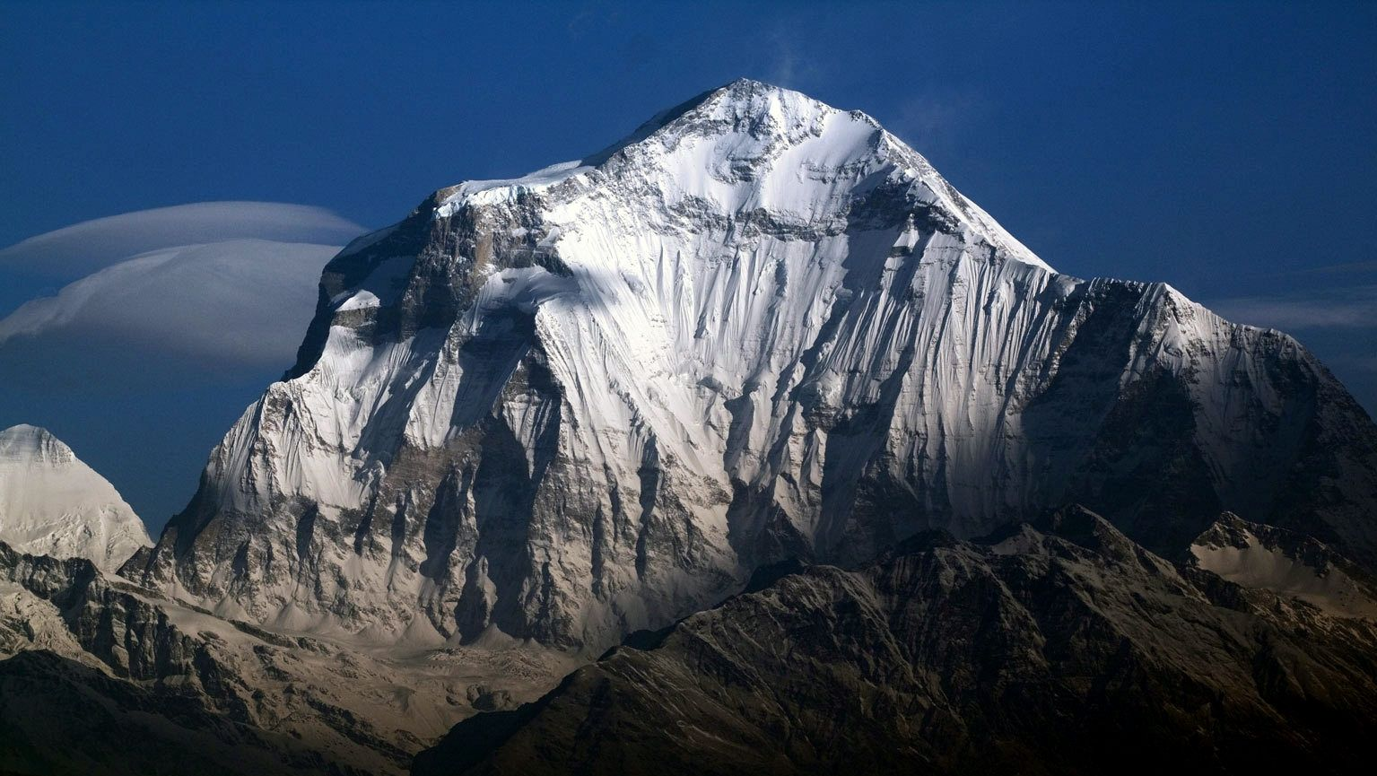 The rock layers found at the summit of Dhaulagiri, as well as Everest, are made up of limestone and dolomite formed at the bottom of the ocean. The summits of the other Himalayan eight-thousanders are made up of granite that was formed deep underground.[8]