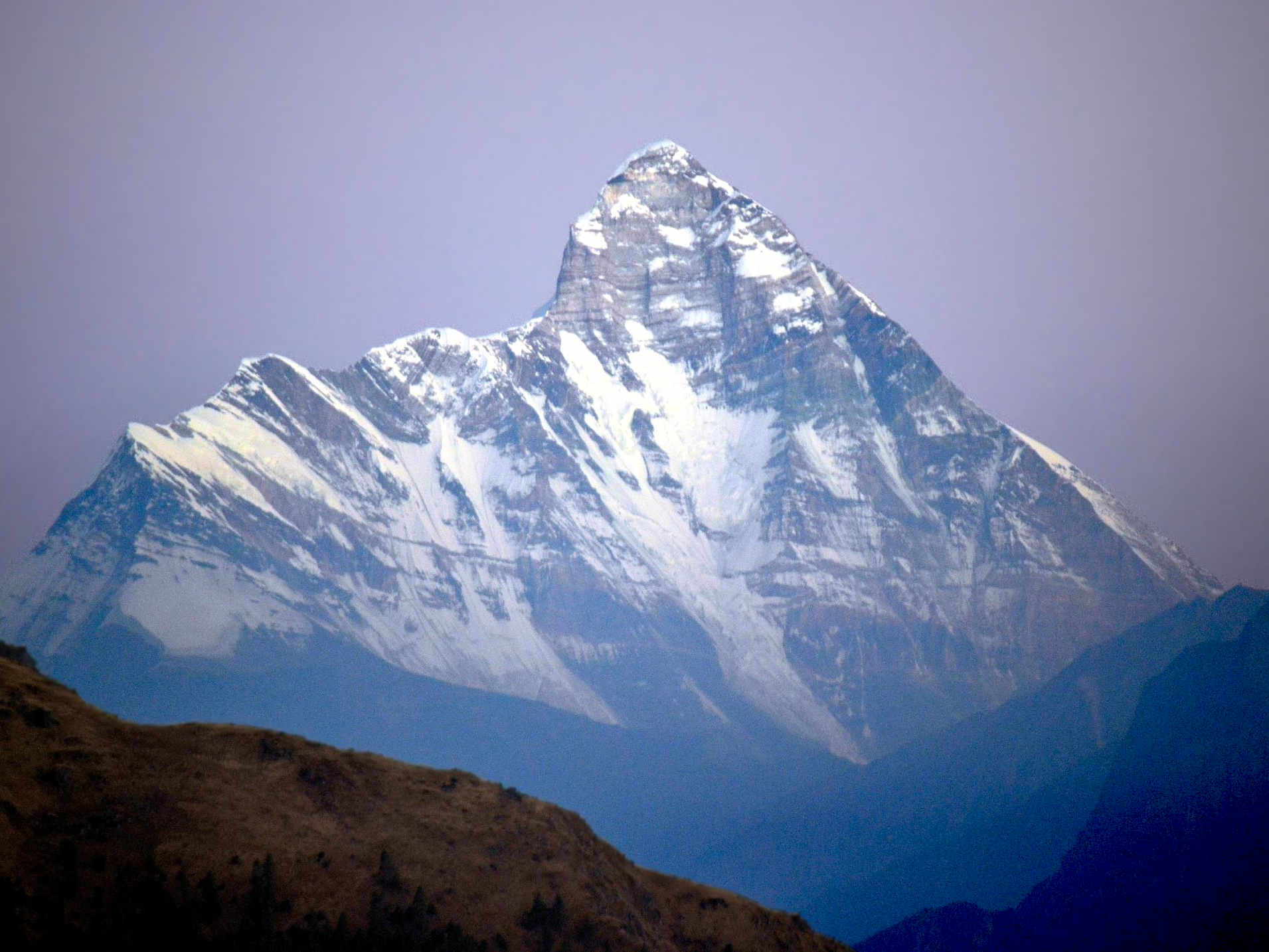 Looking north from the plains of India, most 8,000-metre peaks are obscured by nearer mountains, but in clear weather, Dhaulagiri is conspicuous from northern Bihar[5] and as far south as Gorakhpur in Uttar Pradesh. In 1808, survey computations showed it to be the highest mountain yet surveyed.[6][7] This lasted until 1838 when Kangchenjunga took its place, followed by Mount Everest in 1858.
