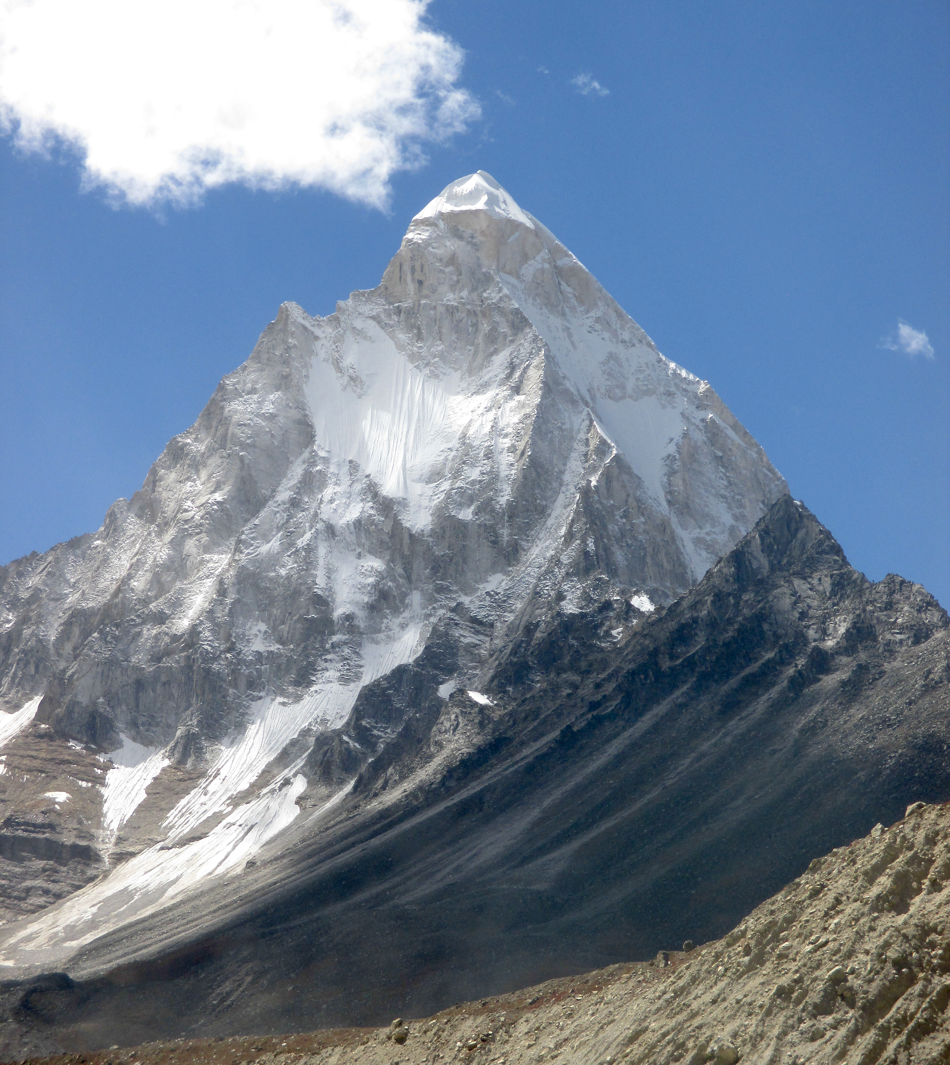 It was also called Mahadeo Ka Linga or (Mahadev Ka Linga) Appearing as a single pyramid when seen from Gaumukh, Shivling is actually a twin-summitted mountain, with the northeast summit being slightly higher than the southwest summit, 6,501 m (21,329 ft). Between Gaumukh and Shivling lies the Tapovan meadow, a popular pilgrimage site due to its inspiring view of the mountain. Shivling is well-defended on all sides by steep rock faces; only the west flank has a moderate enough slope for snow accumulation.[4]