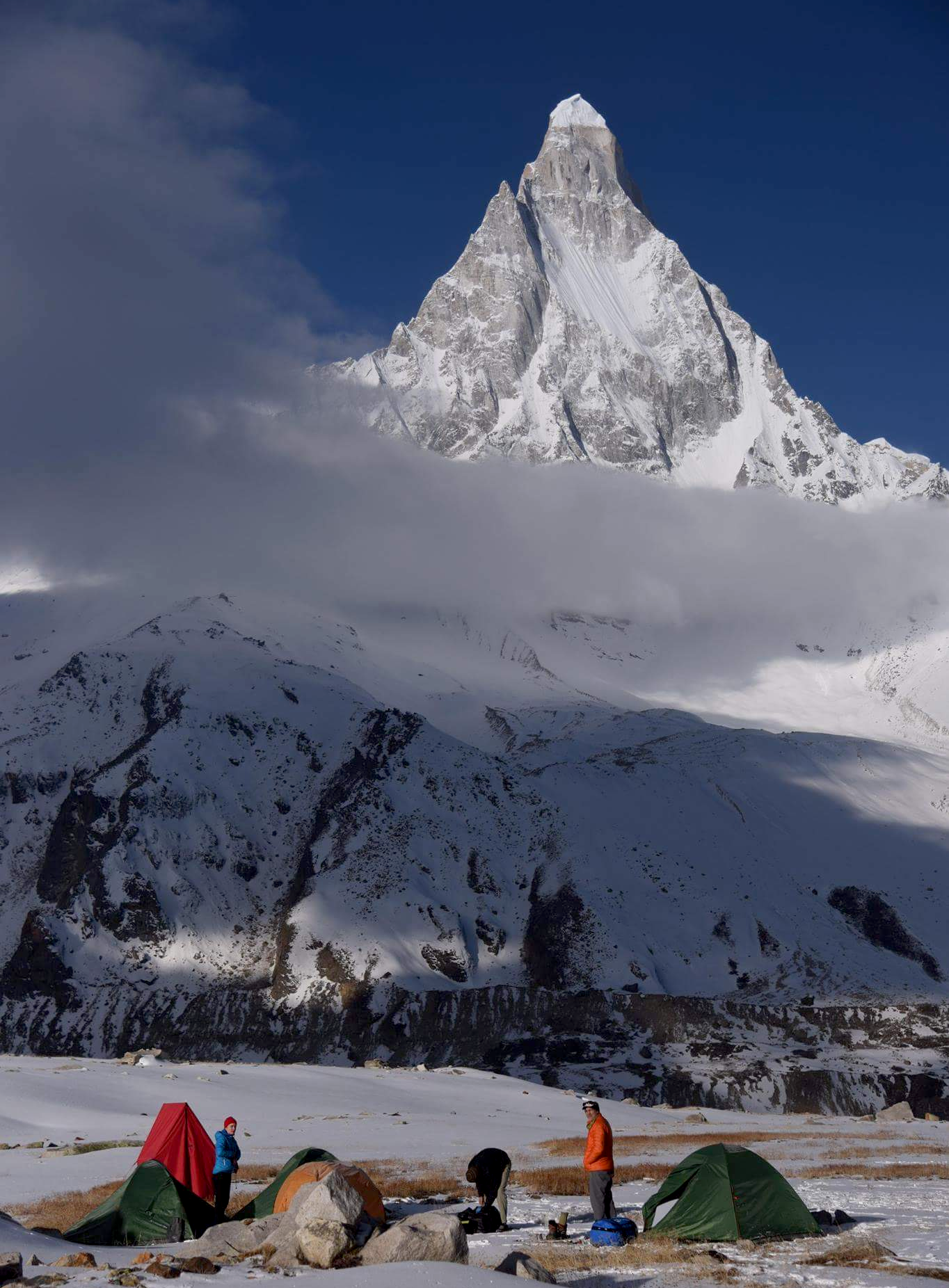 It is believed that Machapuchare has never been climbed to the summit. The only confirmed attempt was in 1957 by a British team led by Lieutenant Colonel Jimmy Roberts. Climbers Wilfrid Noyce and A. D. M. Cox climbed to within 150 ft (46 m) of the summit via the north ridge,[4] to an approximate altitude of 22,793 ft (6,947 m). King Mahendra had given them permission to climb the mountain, but forbade them from stepping foot on the summit itself, Noyce and his team honoured his words and published the only climbing record of the mountain a year later.[5] Early in the expedition another member of the party, Roger Chorley, contracted polio, with help from Jimmy Roberts he left the expedition to seek medical assistance.[6]