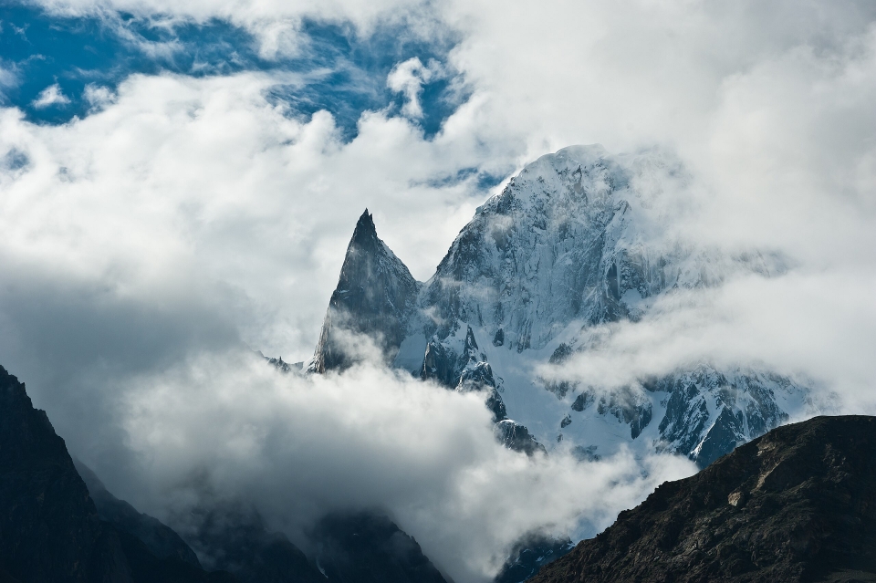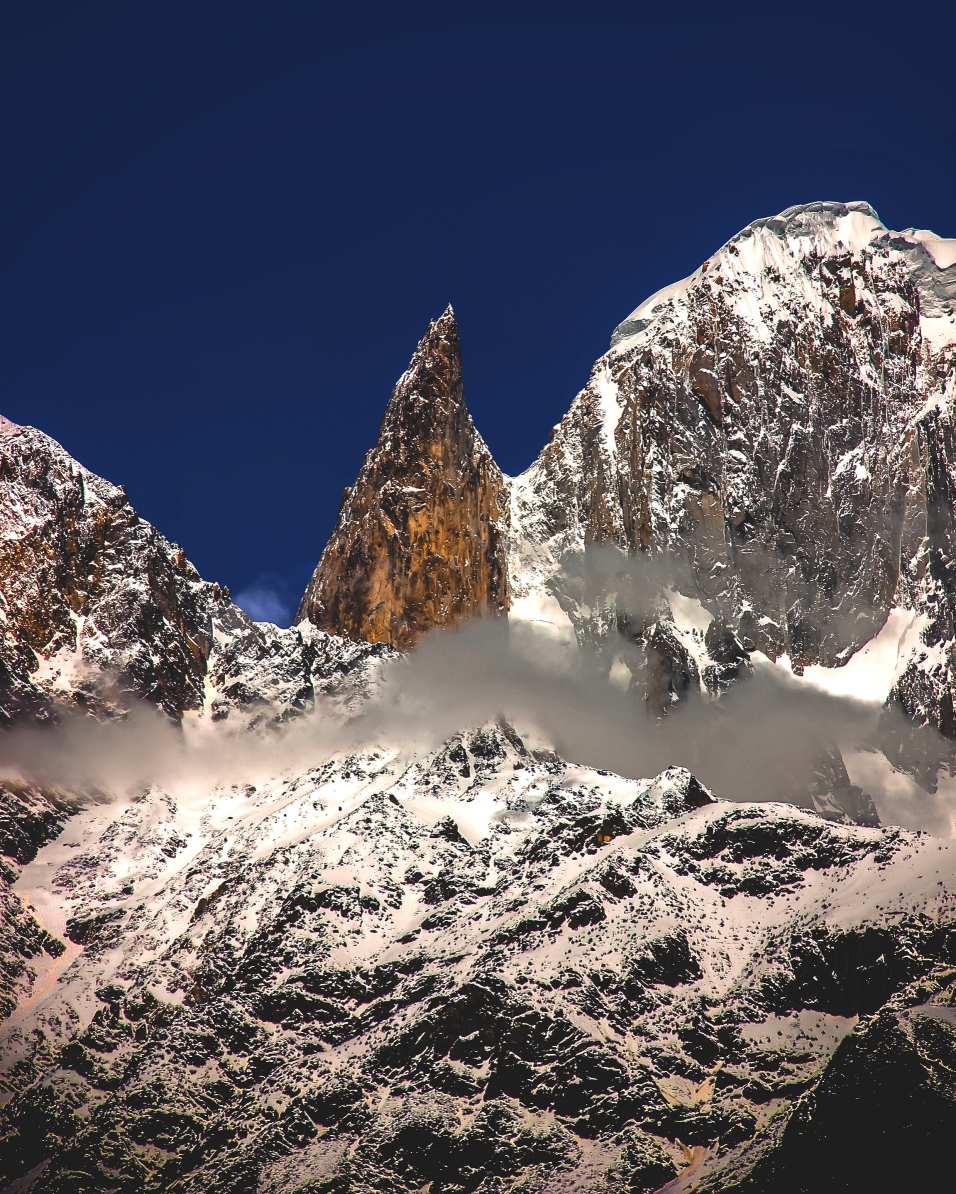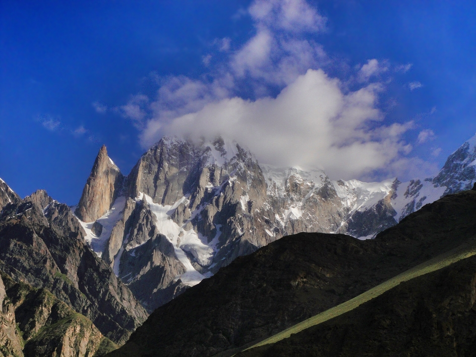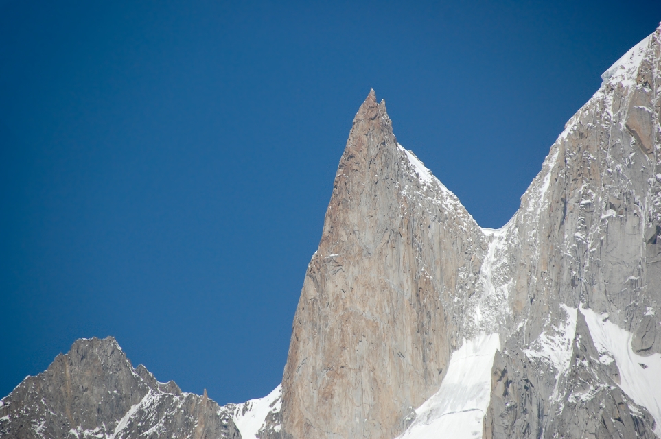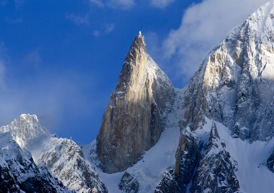 While the nearby Ladyfinger Peak has little prominence above the saddle with Hunza Peak, it is a sharp, relatively snowless rock spire among the peaks around it.