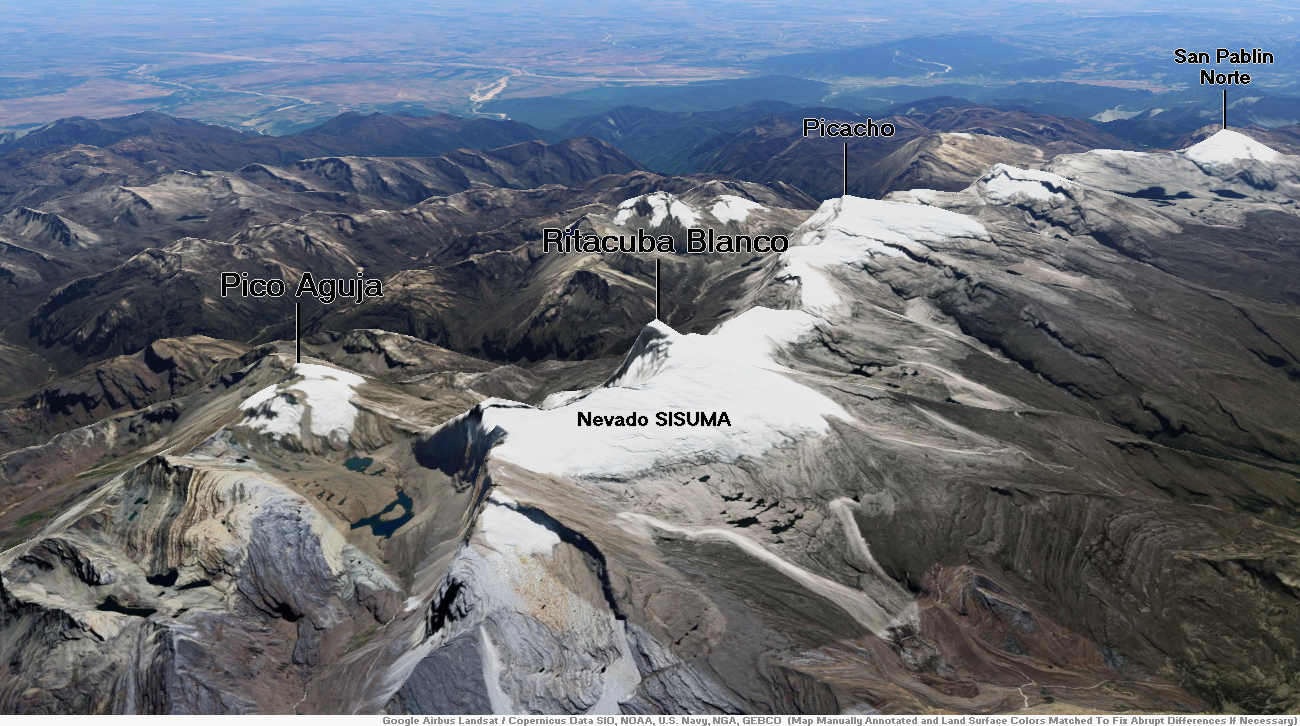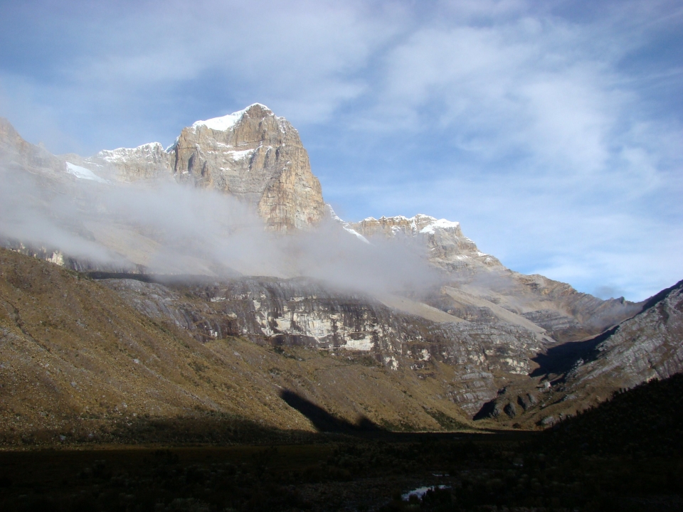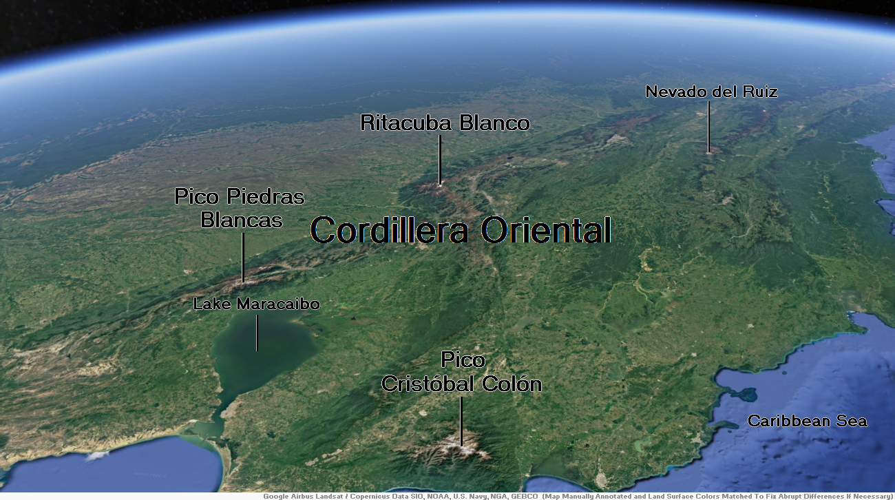 Ritacuba Blanco is the highest peak of Cordillera Oriental, in the Andes Mountains of Colombia. It’s also named Ritak’uwa, an ancient name from the U’wa indigenous people that live in the lowlands of the National Park Sierra Nevada del Cocuy y Güicán, where the Ritacuba Blanco is located. The summit is accessible from the west via the town of El Cocuy, the village of Güicán, and the hamlet of Las Cabañas. The hike is fairly easy, but the weather is not reliable, and a glacier must be crossed. Because of global warming, its glacier is melting at very high rates, backing down 25 linear mts per year; the same is happening at amazing speeds to all other snow-covered tropical mountains in Colombia. In 1950, Ritacuba Blanco’s glacier extended down to 4,100 metres (13,500 ft) above sea level; in January 2007 its lowest point was at 4,500 metres (14,800 ft) above sea level. If this melting rate continues, the glacier is expected to disappear before 2055.