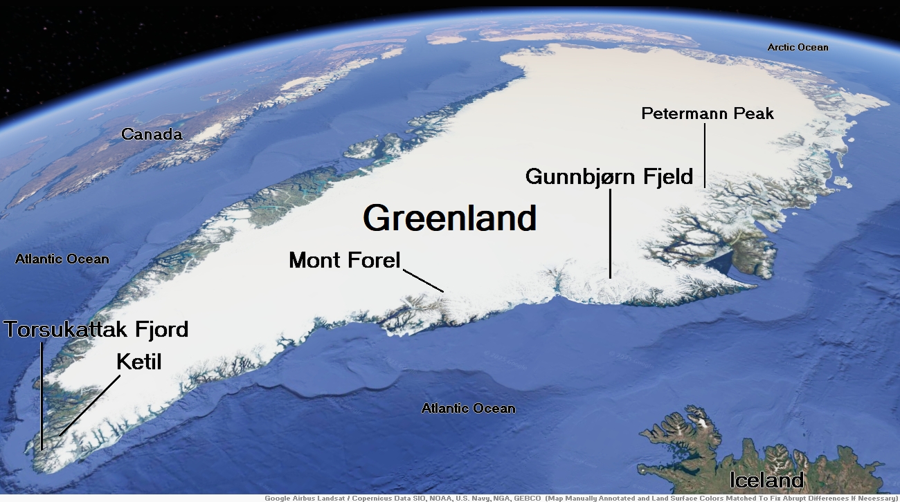 The Petermann Peak is marked as a 2,940-metre-high (9,646 ft) peak in the Defense Mapping Agency Greenland Navigation charts[7] and as a 2,790-metre-high (9,154 ft) mountain in other sources.[8]