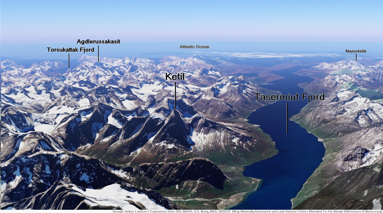 Together with Nalumasortoq and Ulamertorsuaq, Ketil is part of the group of three massive largely unglaciated rocky mountains rising in the peninsula of the mainland which forms the eastern side of the Tasermiut Fjord.[4]