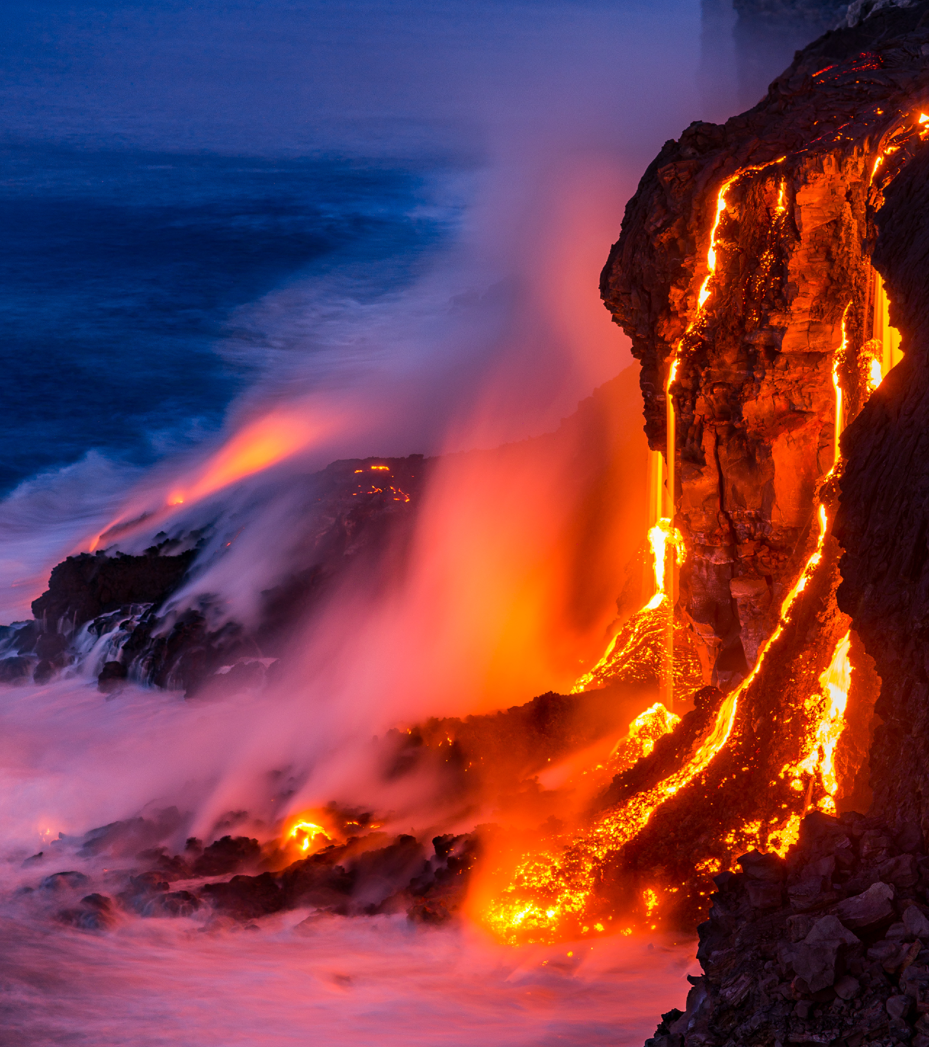 Beginning in May 2018, activity shifted further downrift from the summit to the lower Puna district, during which lava erupted from two dozen vents with eruptive fountains that sent rivers of lava into the ocean in three places. The eruption destroyed Hawaii’s largest natural freshwater lake, covered substantial portions of Leilani Estates and Lanipuna Gardens, and destroyed the communities of Kapoho, Vacationland Hawaii, and most of the Kapoho Beach Lots.[4][5] The County of Hawaii reported that 716 dwellings were destroyed.[6] Concurrent with the activity downrift in lower Puna, the lava lake within Halemaʻumaʻu drained and a series of explosive collapse events occurred at the volcano’s summit, with at least one explosion emitting ash 30,000 feet (9,100 m) into the air. This activity prompted a months-long closure of the Kīlauea section of Hawaii Volcanoes National Park.[7] The eruption ended in September 2018.[6] Since 2020, several eruptions have occurred within the enlarged caldera left by the 2018 collapse events as well as along the volcano’s southwest and east rift zones.