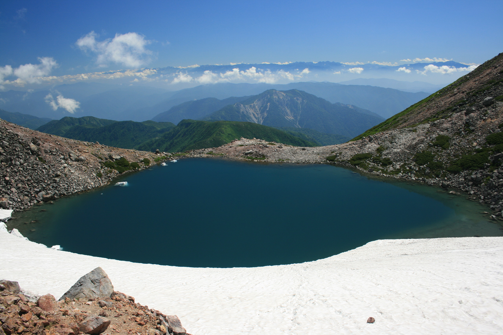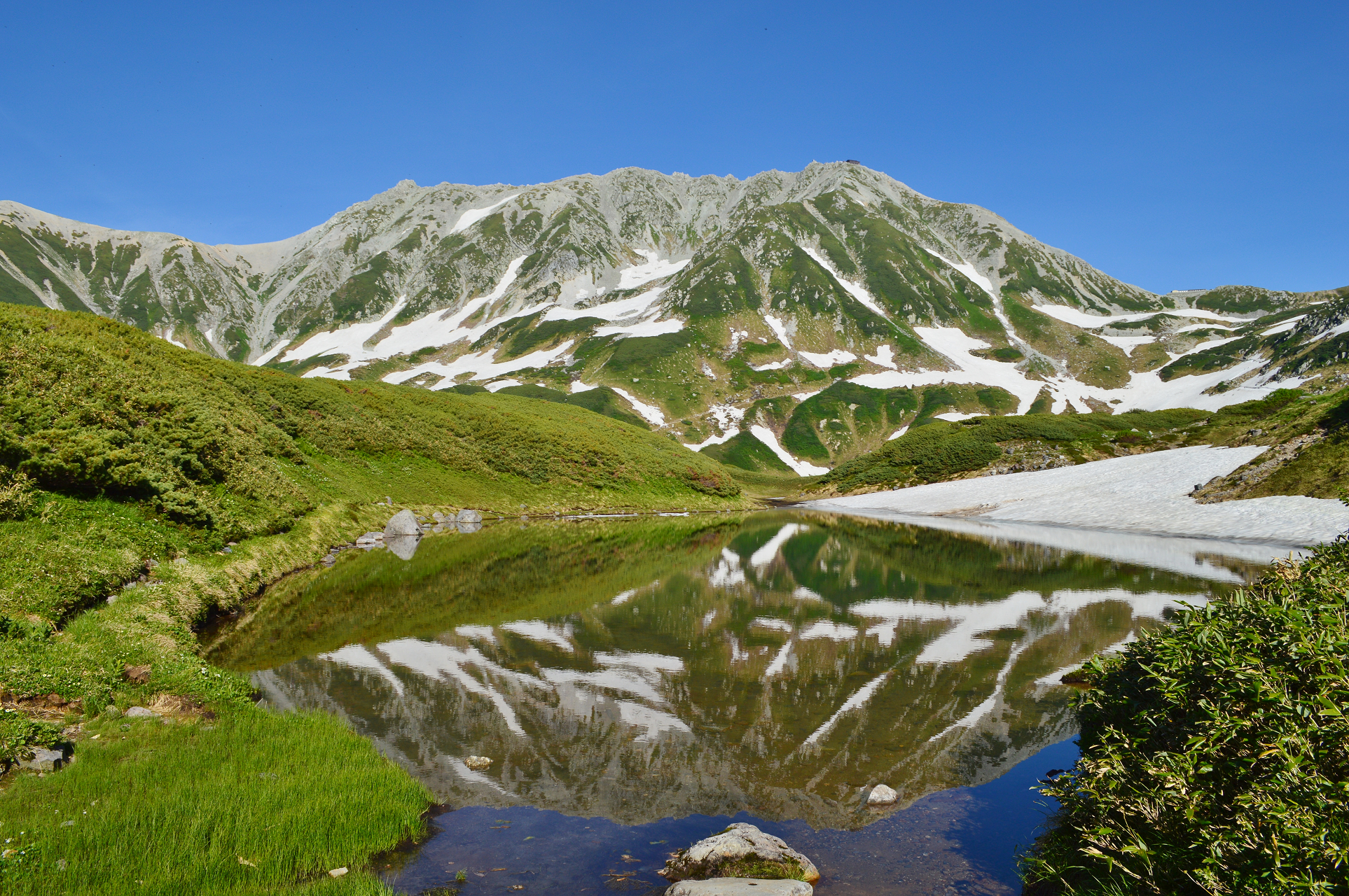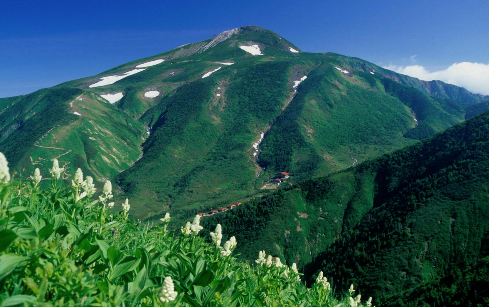 The mountain’s tallest peak, Gozenga-mine (御前峰), is the one that gives the mountain its height of 2,702 m (8,865 ft). Along with Ken-ga-mine (剣ヶ峰), which is 2,677 m (8,783 ft), and Ōnanji-mine (大汝峰), which is 2,648 m (8,688 ft), the three peaks are considered “Mount Haku’s Three Peaks” (白山三峰 Hakusan San-mine). Mount Bessan and Mount Sannomine are sometimes included and called “Mount Haku’s Five Peaks” (白山五峰 Hakusan go-mine).