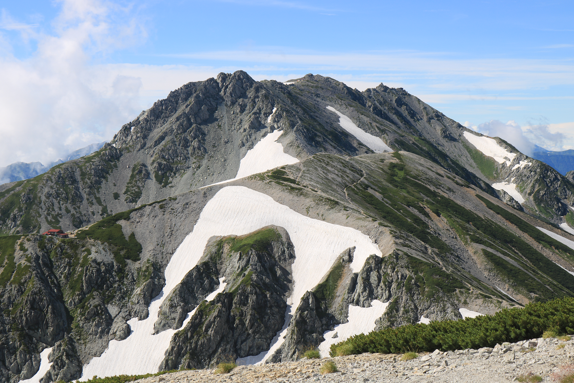 Mount Aino (間ノ岳, Aino-dake), with a peak at 2,907 m (9,537 ft), lies on a ridge between Mount Okuhotaka and Mount Nishihotaka.