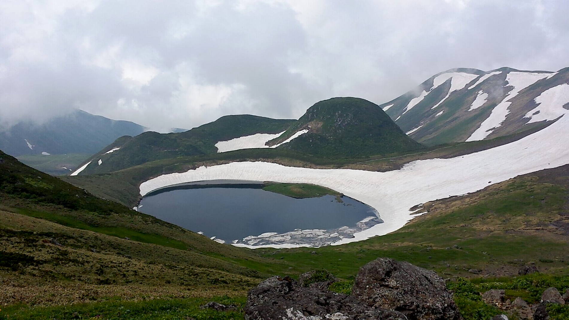 On the south side of the mountain is “Shinji Sekkei,” where snow remains in the shape of the kanji for “heart” in even in summer, and portions of the summit have perennial snow, and geological evidence of glaciation in the recent past.