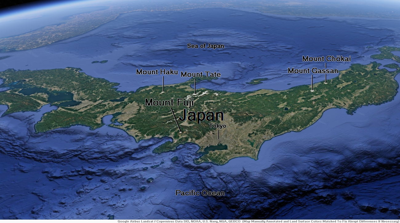 Mount Haku (白山, Haku-san; “White Mountain”), or Mount Hakusan (commonly referred to as simply Hakusan), is a dormant stratovolcano in Japan. It is located on the borders of Gifu and Ishikawa, on the island of Honshu. Mount Haku is thought[2] to have first been active 300,000 to 400,000 years ago, with the most recent eruption occurring in 1659. Along with Mount Tate and Mount Fuji, it is one of Japan’s “Three Holy Mountains” (三霊山, San-rei-zan).[3]