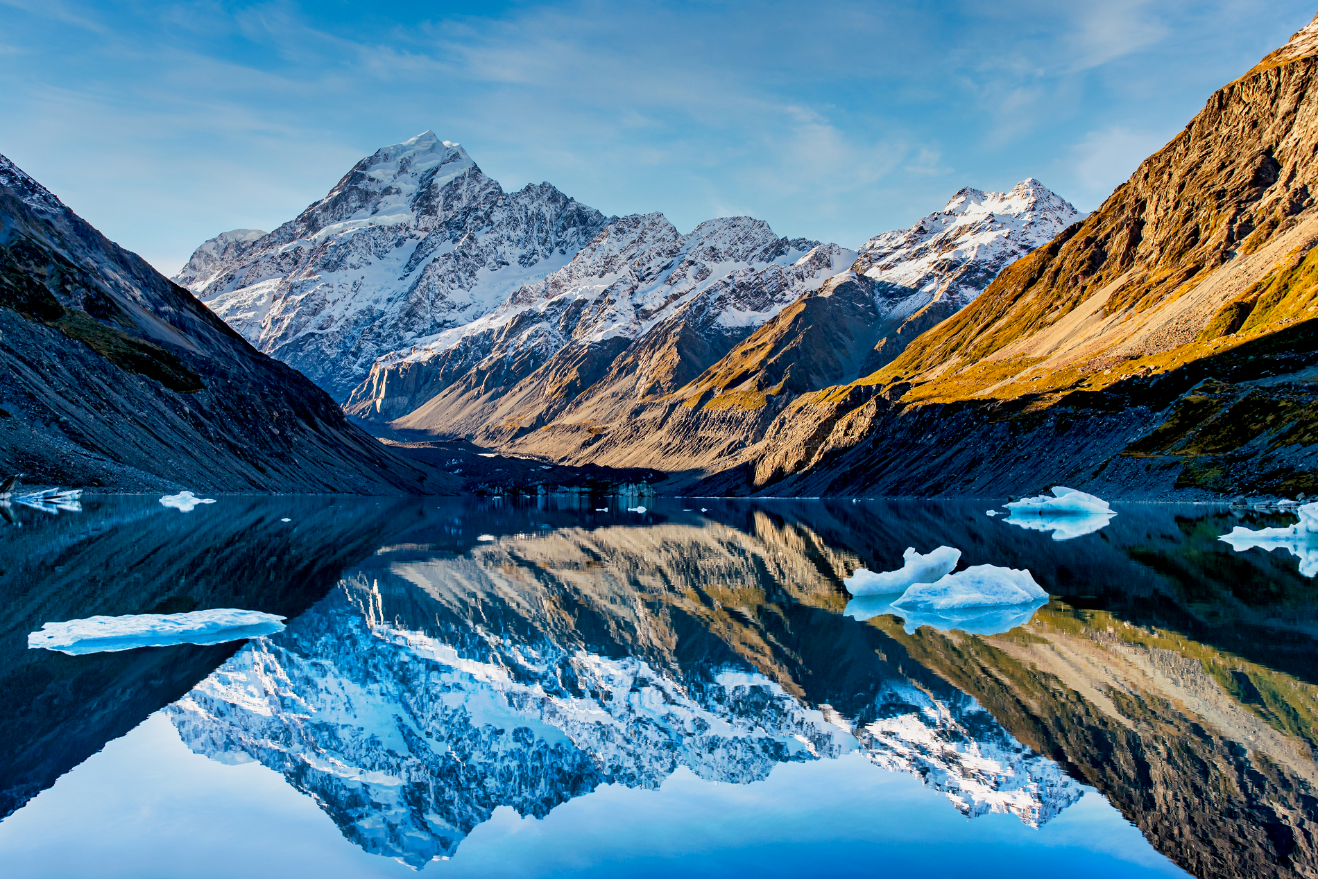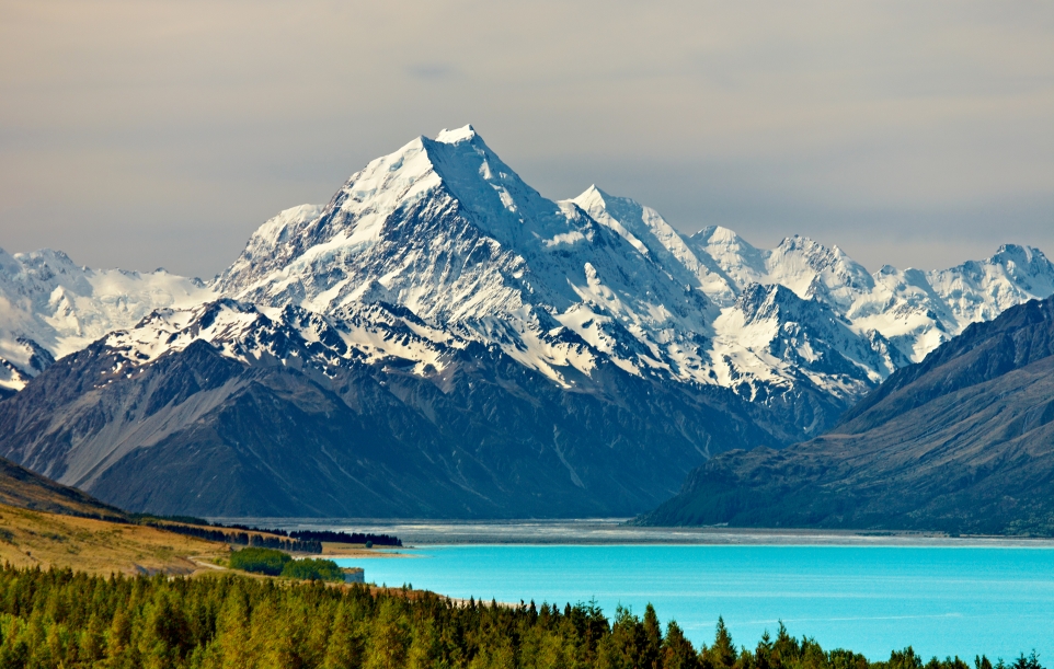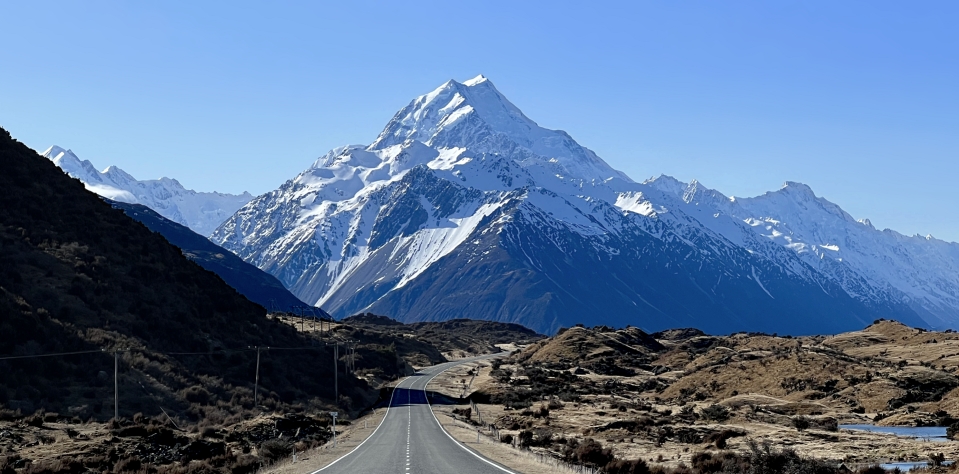 On clear days, Aoraki / Mount Cook is visible from the West Coast as far north as Greymouth, some 150 km (93 mi) away, and from most of State Highway 80 along Lake Pukaki and State Highway 6 south of Lake Pukaki. The near horizontal ridge connecting the mountain’s three summits forms a distinctive blocky shape when viewed from an eastern or western direction. Another popular view point is from Lake Matheson on the West Coast, described as the “view of views”, where on calm days, the peaks of Aoraki / Mount Cook and Mt Tasman are reflected in Lake Matheson.[8]