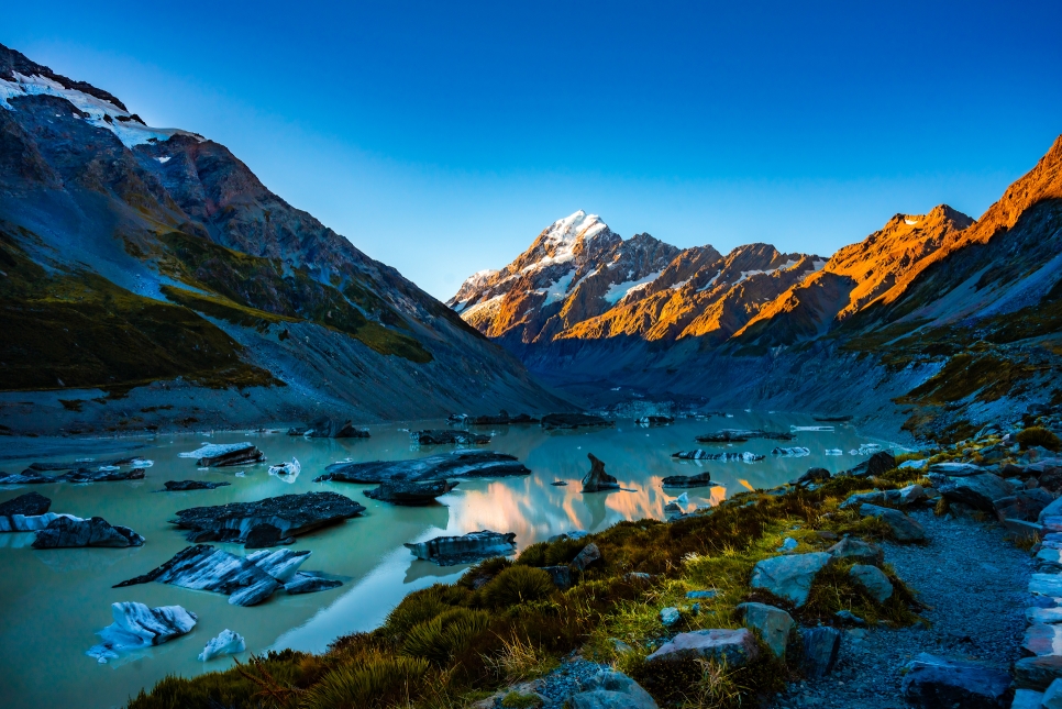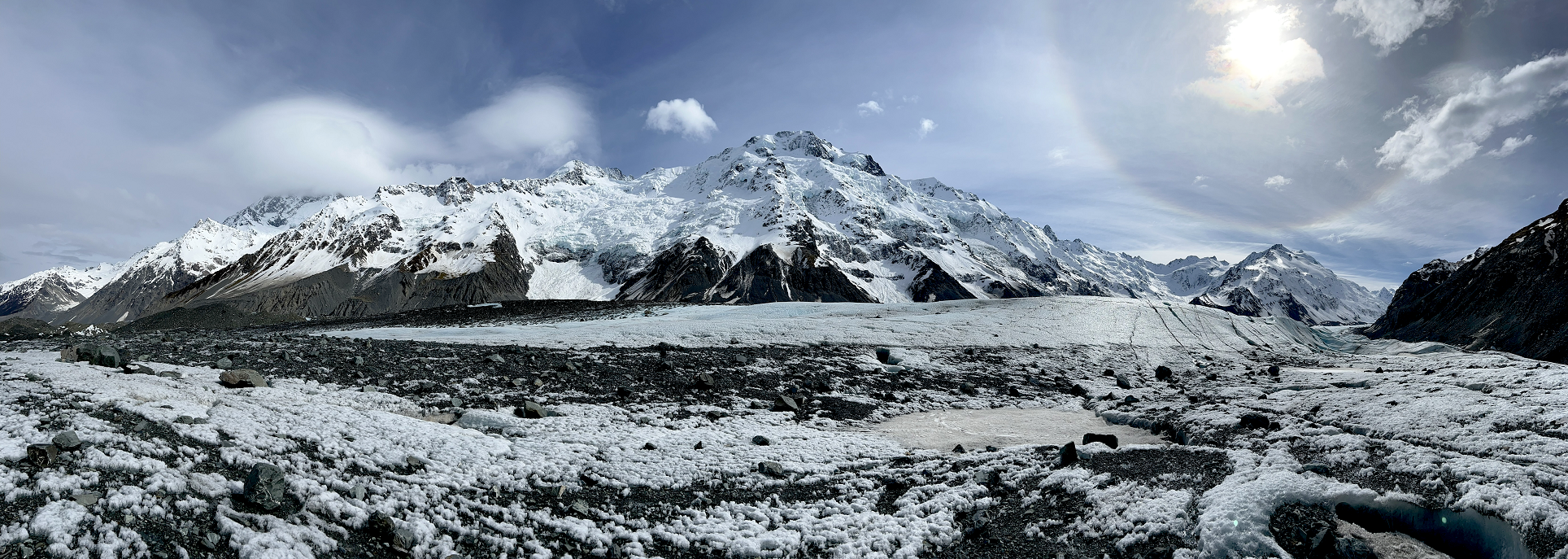 The settlement of Mount Cook Village, also referred to as “Aoraki / Mount Cook”, is a tourist centre and base camp for the mountain. It is 7 kilometres (4.3 mi) from the end of the Tasman Glacier and 15 kilometres (9.3 mi) south of Aoraki / Mount Cook’s summit.[7]