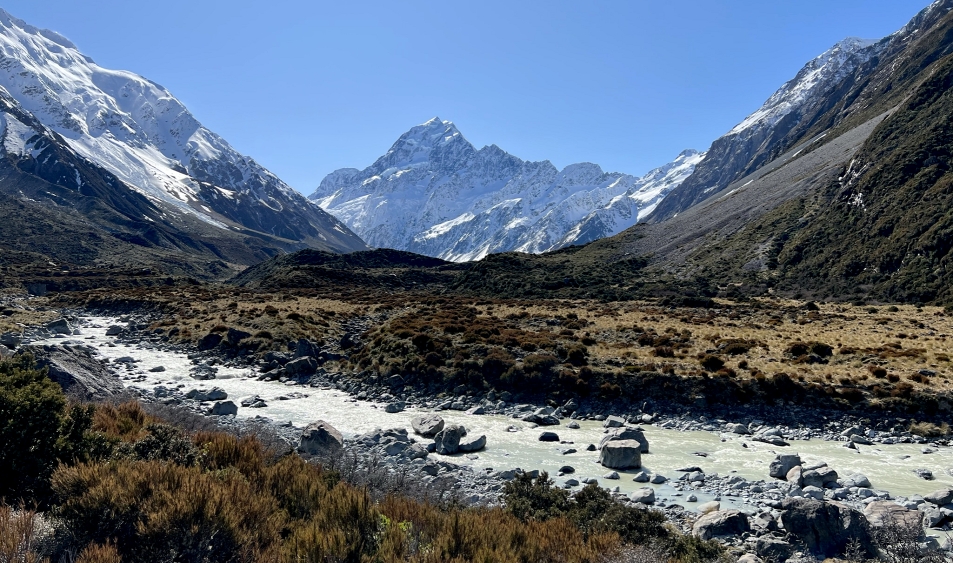The peak is located at the northern end of the Mount Cook Range, where it meets with the main spine of the Main Divide, forming a massif between the Hooker Valley to the southwest and the Tasman Valley east of the mountain. These two valleys provide the closest easily accessible view points of Aoraki / Mount Cook. A lookout point at the end of the Hooker Valley Track located only 10 kilometres (6.2 mi) from the peak has views of the entire mountainside.[5][6]