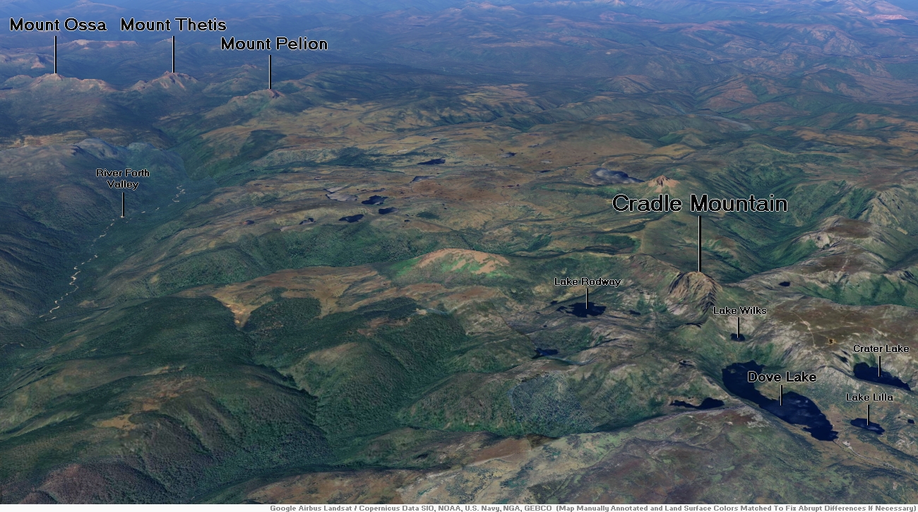 It was first surveyed by Charles Gould in the 1860s and named after Mount Ossa in Greece following the theme of classical Greek names set by George Frankland, an early Tasmanian surveyor.[6][7] However, its location was marked as on what is now called Mount Nereus, and later surveyors alternatively referred to it as Parsons Hood, Mount Dundas, Mount Blackhouse or simply numbered it. For years it was thought that Cradle Mountain was the highest in Tasmania, with inexact equipment stymying attempts to closely examine the area.[8][9]