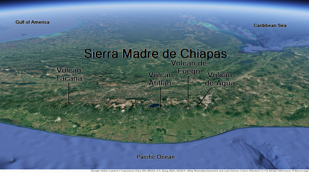 Tacaná is the first of hundreds of volcanoes in a 1,500 km (930 mi) km row, arranged NW to SE, parallel to the Pacific Ocean coast of Central America, known as the Central America Volcanic Arc, formed by an active subduction zone along the western boundary of the Caribbean Plate.