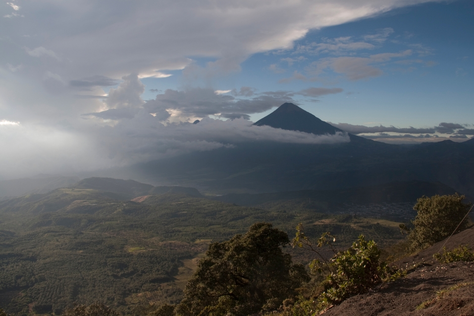 Volcán de Agua (also known as Junajpú by Maya) is an extinct stratovolcano located in the departments of Sacatepéquez and Escuintla in Guatemala. At 3,760 m (12,340 ft), Agua Volcano towers more than 3,500 m (11,500 ft) above the Pacific coastal plain to the south and 2,000 m (6,600 ft) above the Guatemalan Highlands to the north. It dominates the local landscape except when hidden by cloud cover. The volcano is within 5 to 10 km (3.1 to 6.2 mi) of the city of Antigua Guatemala and several other large towns situated on its northern apron. These towns have a combined population of nearly 100,000. It is within about 20 km (12 mi) of Escuintla (population, c. 150,000) to the south.[2] Coffee is grown on the volcano’s lower slopes.