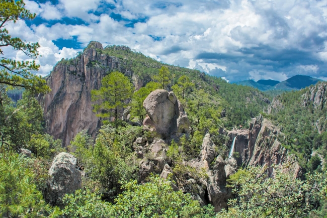 Basaseachic Falls is located in the high mountains of the Sierra Madre Occidental, in the Municipality of Ocampo, 3 km (1.9 mi) from Basaseachi community and about 265 km (165 mi) west of Chihuahua.[1] It is reached via Federal Highway 16 and its surroundings make up the Basaseachic Falls National Park (Parque Nacional Cascada de Basaseachic).