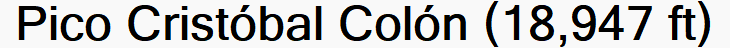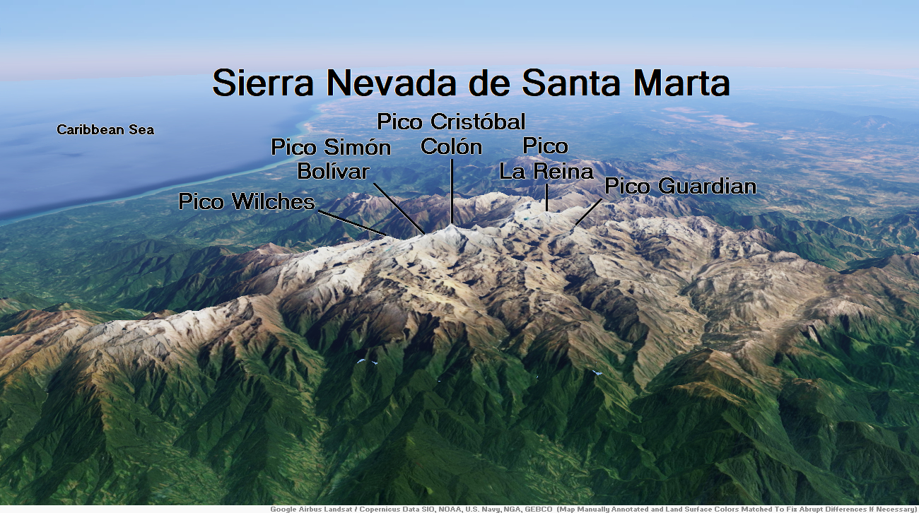 Pico Cristóbal Colón, known as Gonawindua in the indigenous Kogi language, is the second highest mountain in Colombia, with a reported height of 5,712.8 metres (18,743 ft).[1] It is 7.6 metres lower than Colombia’s highest mountain, Pico Simón Bolívar. There is a permanent snowcap on this peak and on the nearby mountains. It is part of the Sierra Nevada de Santa Marta range, along with Pico Simón Bolívar, and was named after Christopher Columbus.